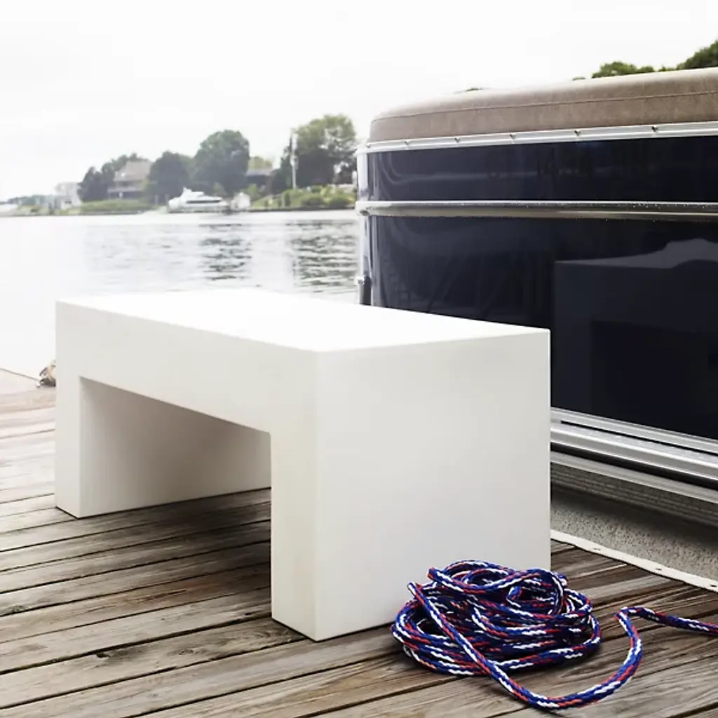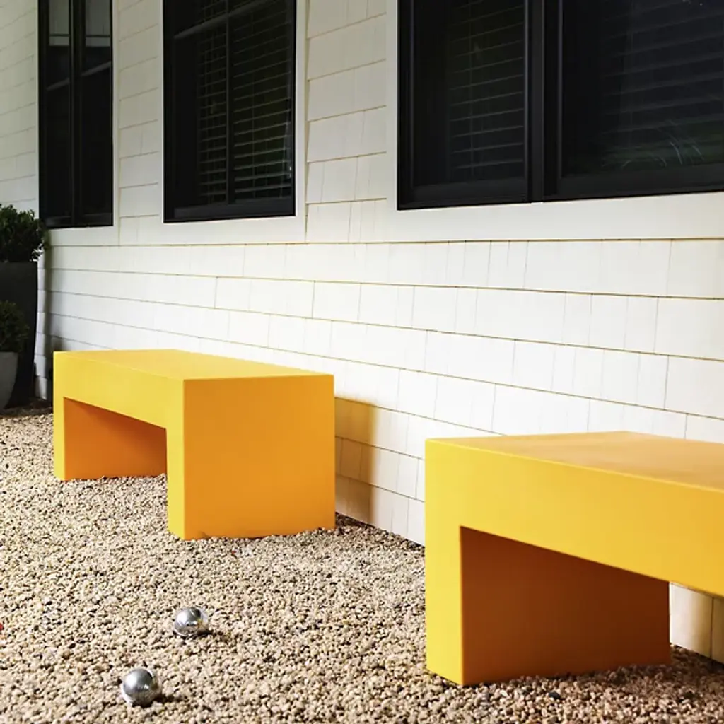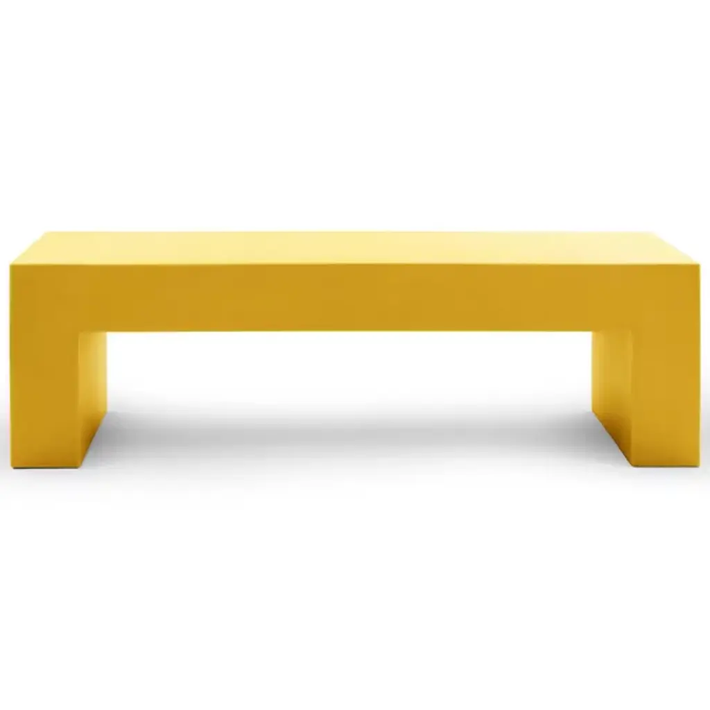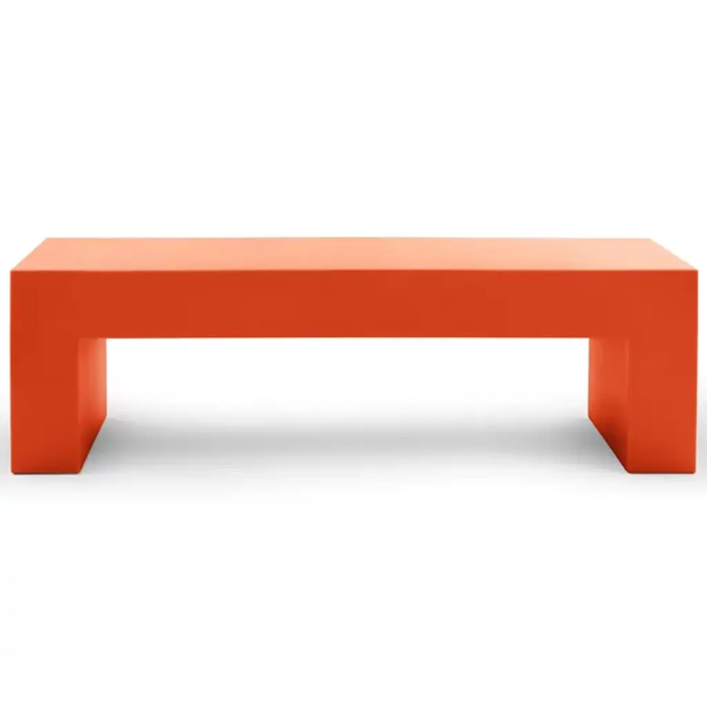A bench that's long on contemporary style as well as convenient seating. At 6 feet wide, the Heller Furniture Vignelli Bench can easily seat 3 people. While it looks like concrete, the Outdoor Bench is actually made out of one piece of grey polyethylene, which ensures the bench's durability in just about any setting, indoors or out.