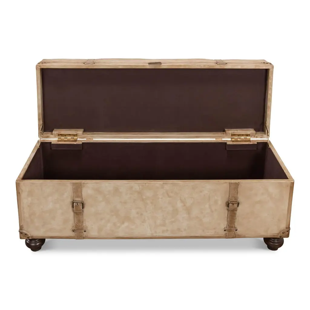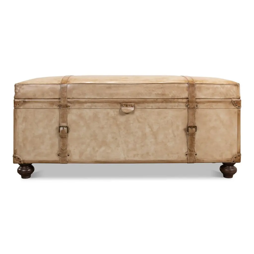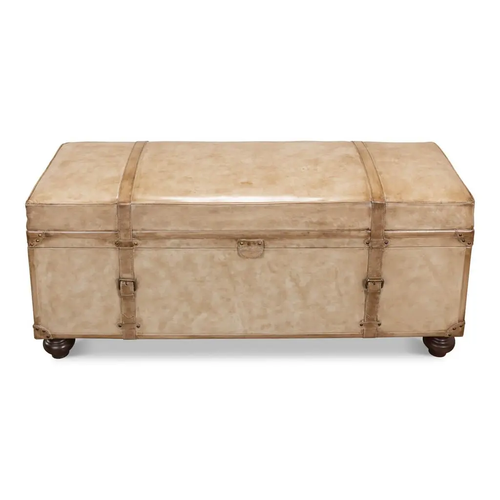Vintage-style pearl leather trunk bench. A fully functional trunk that hinges open to reveal storage. The padded leather exterior makes it a great bench to sit on or a low table to put your feet up, too. This piece has lots of vintage-inspired design details including straps and buckles. The leather is also a beautiful creamy pearl color and sits on dark stained bun feet. Dimensions: 48" W x 16" D x 20" H