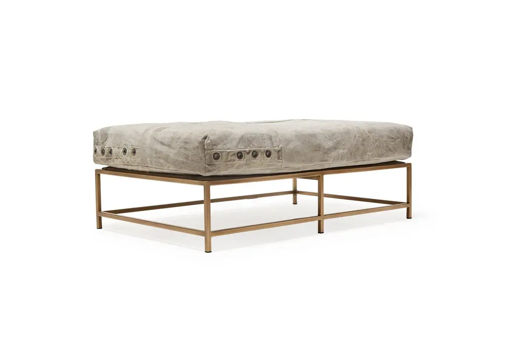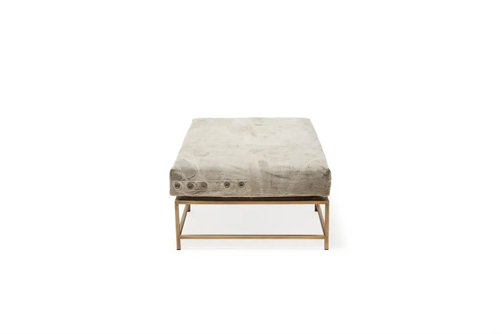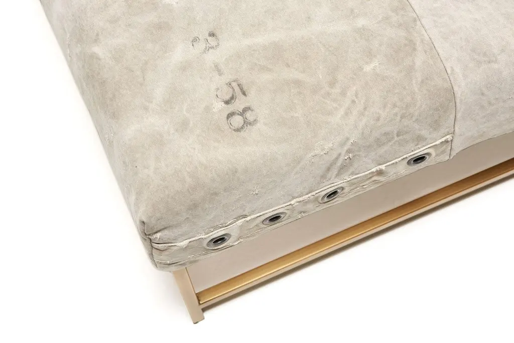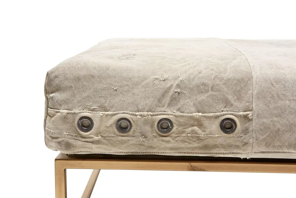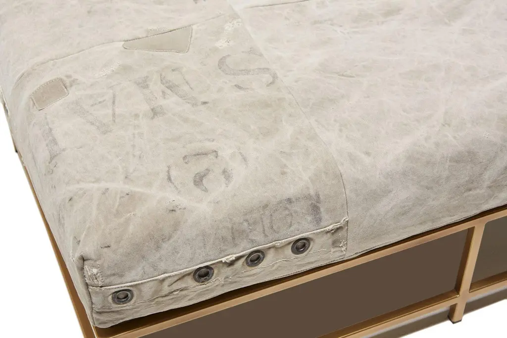 This bench, in the style of Stephen's Kenn Inheritance Collection, has been upholstered with a patchwork of vintage US mailbag canvas material. Since first designing Inheritance Collection, Stephen Kenn has been inspired by the inherent history in vintage materials. Each piece of washed canvas used in this upholstery is distinctive and will have unique markings from its long history of use as a mailbag. The textile has been lovingly repaired and reinforced, without losing any of the beautiful character that comes with great age and regular use. The Bench's steel frame has a plated antique brass finish. Every Stephen Kenn piece is made to order through our Los Angeles studio. We create these pieces utilizing a number of small businesses and fabricators in the LA area.