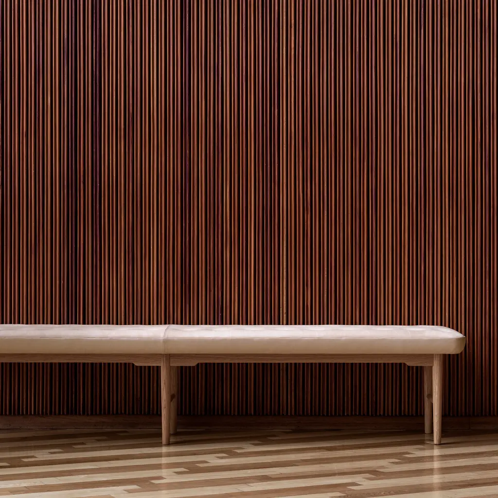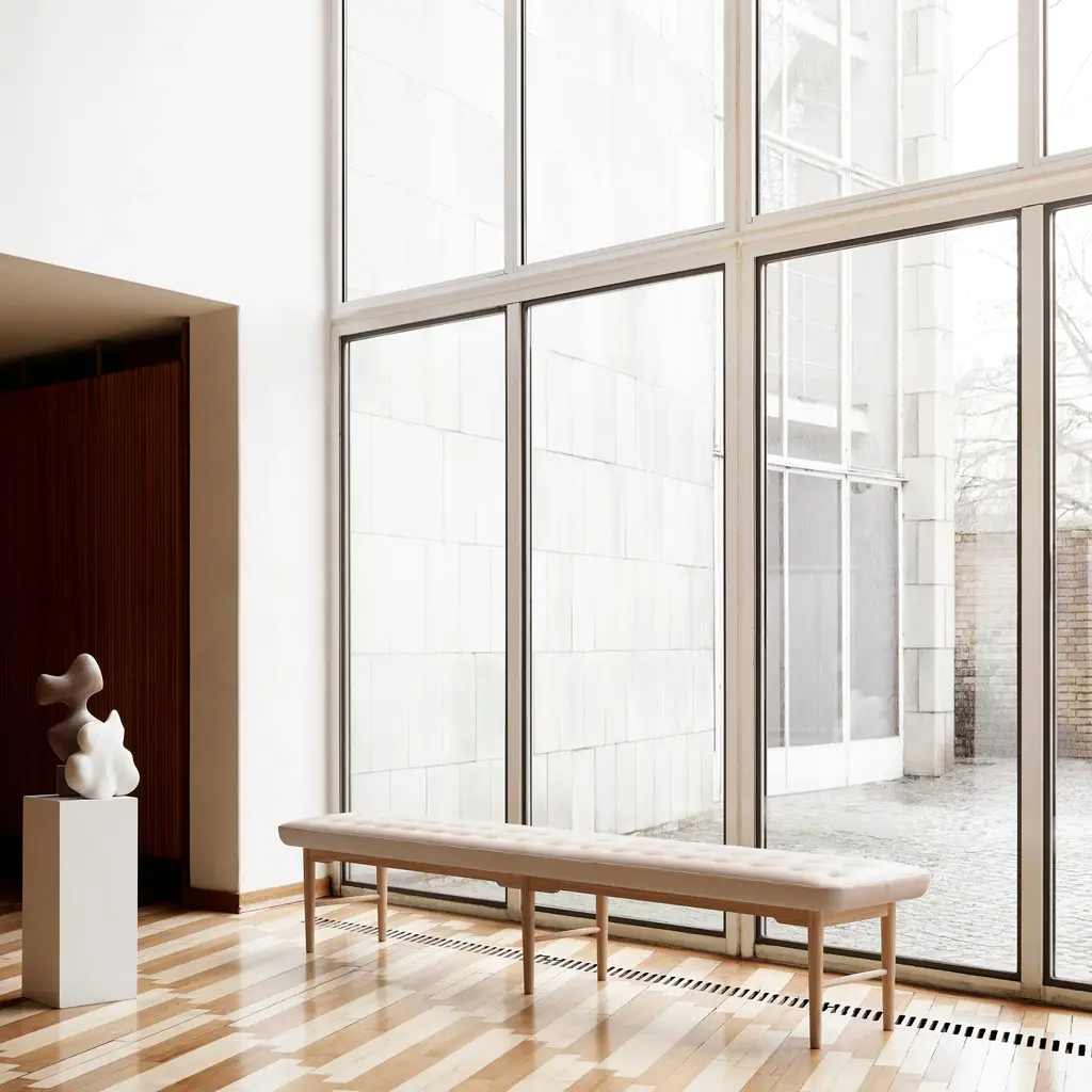 From the Foyer series created by Vilhelm Lauritzen for Copenhagen's Radiohuset broadcast center in 1945, VLA75 features a solid-oak frame in soaped, oiled or smoked oiled finish. The upholstered seat cushion is meticulously upholstered in a custom choice of textile or leather options with handmade buttons. With this timeless piece from a father of Danish Modernism who created everything from door handles and railings to lamps and furniture, Carl Hansen & Søn extends Lauritzen's legacy.
