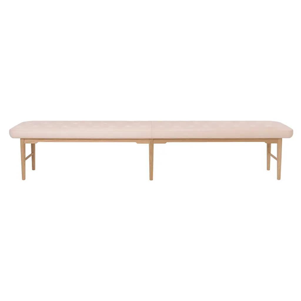 The Foyer Bench has a delicate idiom and is meticulously upholstered with handmade buttons. The Foyer Series was exclusively created by Vilhelm Lauritzen for Radiohuset in Copenhagen in 1945. One of three furniture pieces created in 1945 by Vilhelm Lauritzen, the Foyer Bench was initially designed for Copenhagen's Radiohuset, which today houses the Royal Danish Academy of Music. Simple in its expression, the bench holds an upholstered cushion with handmade buttons on its solid oak frame. Adapted in length and comfort to present-day needs, the beauty of its original design remains now and for generations to come.