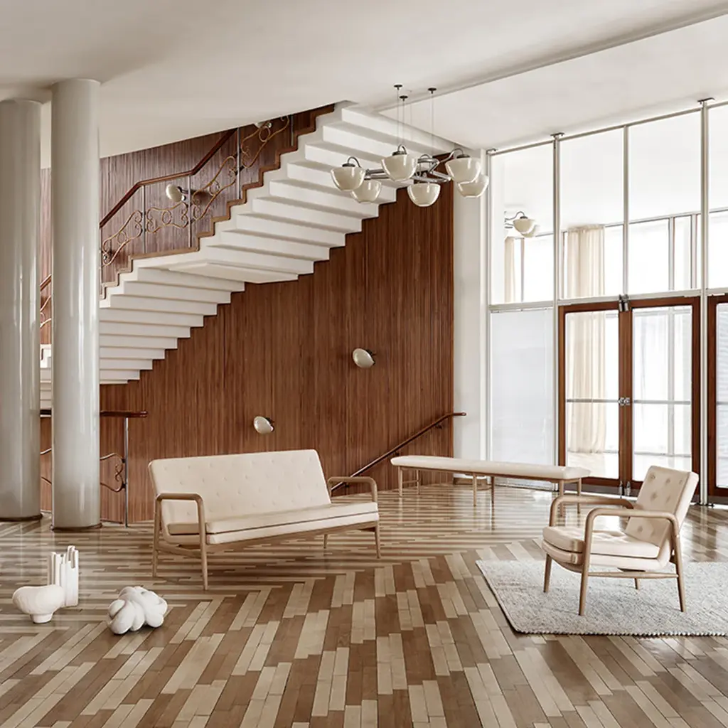 The Foyer Bench has a delicate idiom and is meticulously upholstered with handmade buttons. The Foyer Series was exclusively created by Vilhelm Lauritzen for Radiohuset in Copenhagen in 1945. One of three furniture pieces created in 1945 by Vilhelm Lauritzen, the Foyer Bench was initially designed for Copenhagen's Radiohuset, which today houses the Royal Danish Academy of Music. Simple in its expression, the bench holds an upholstered cushion with handmade buttons on its solid oak frame. Adapted in length and comfort to present-day needs, the beauty of its original design remains now and for generations to come.