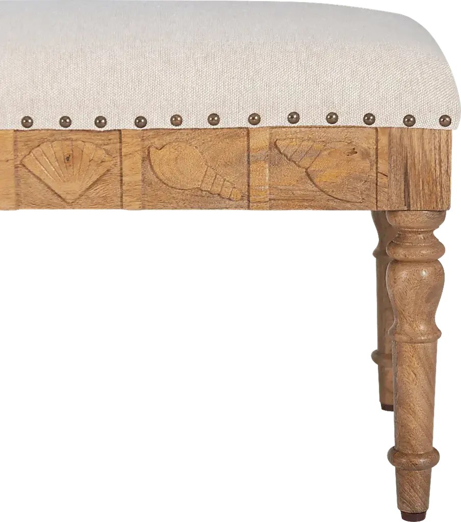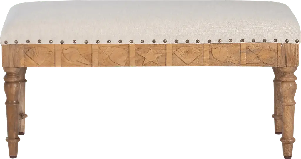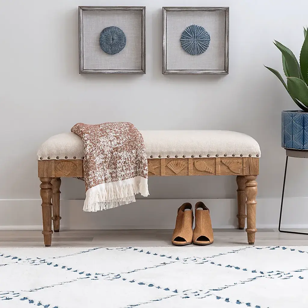 Introducing our Vontue seashell bench, an upholstered coastal charmer that brings the beach vibes to your home Constructed from mango wood, MDF, and adorned in a natural brown finish, this bench is more than just a seat it's a seaside escape. Whether in your entryway or adding charm to your bedroom, this small bench is a cozy coastal retreat. Dive into comfort and style with our seashell bench, where every moment feels like a day spent shoreside. Customer assembly required.