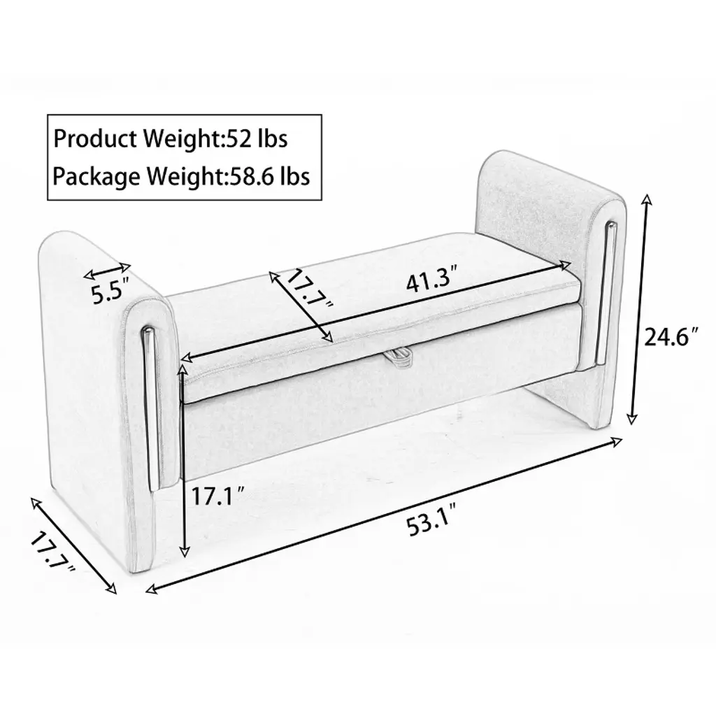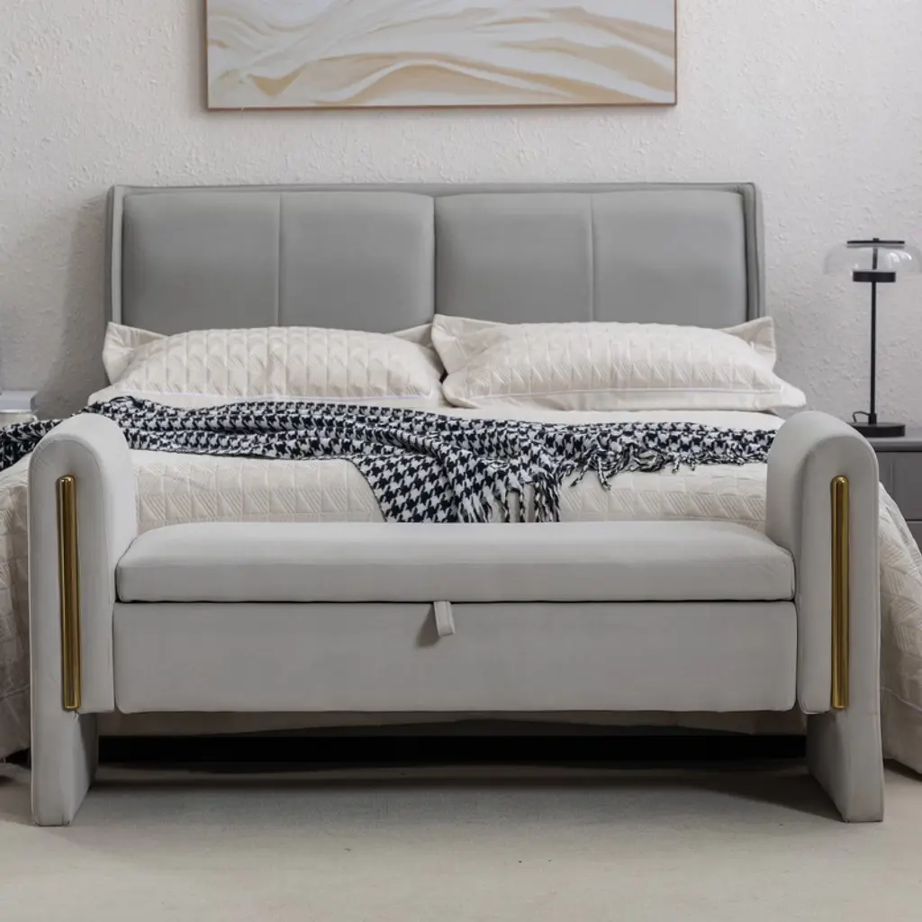Introducing the VYNXARIA 032 Light Gray Velvet Storage Bench. Measuring 53.1"D¡Á17.7"W¡Á24.6"H and weighing 52 LBS, it's a substantial addition to any indoor space. Crafted with a combination of velvet fabric, a solid wood frame, a gold metal trim strip, and sponge filling, it exudes elegance. Ideal for use as a bedroom bench or shoe bench in living rooms, bedrooms, or other indoor areas, it offers a storage solution with a capacity of up to 300 LBS. Assembly is a breeze - one person can complete it in just 10 minutes. And for maintenance, simply wipe it with a damp rag. It's not only practical but also a stylish piece that will enhance the decor of your home.