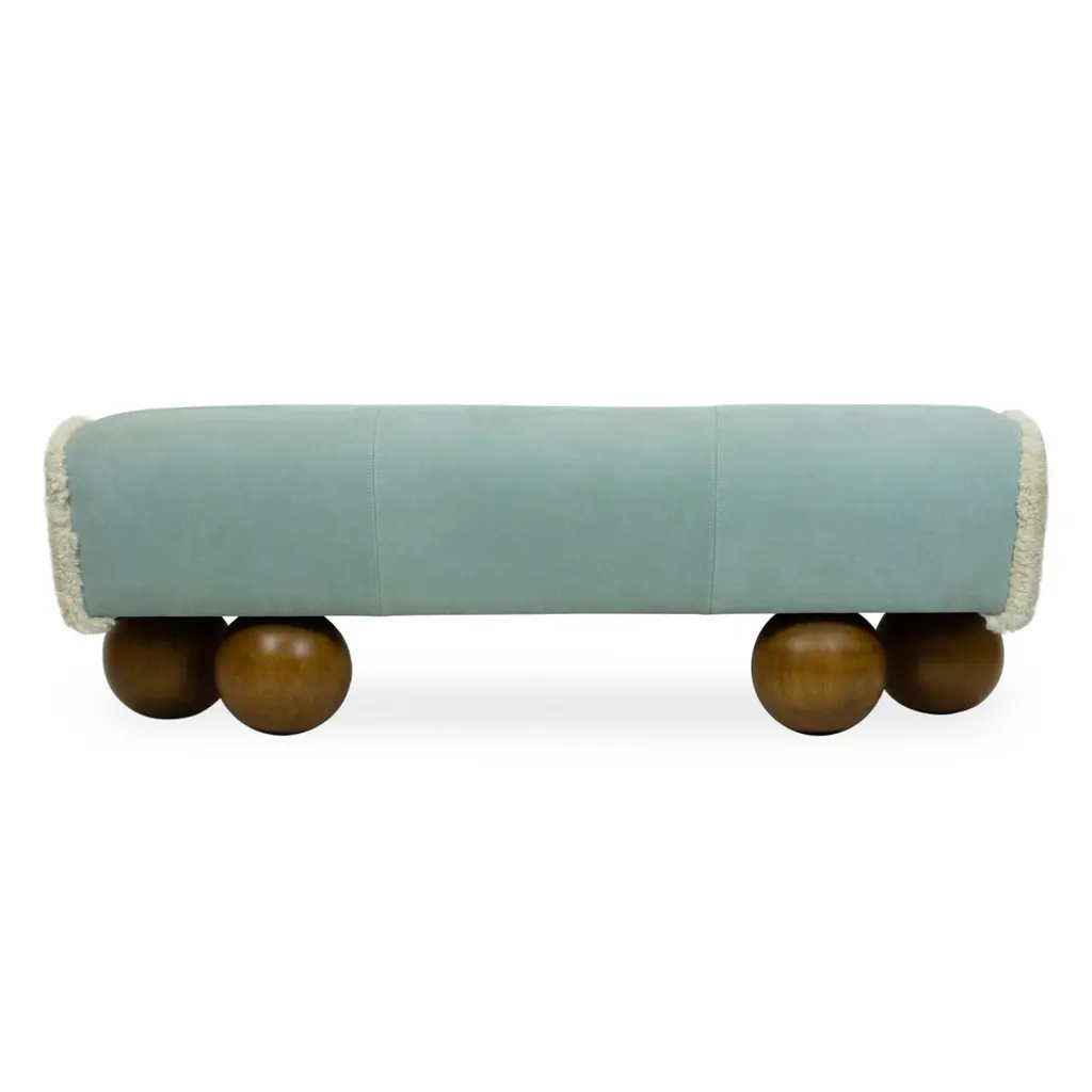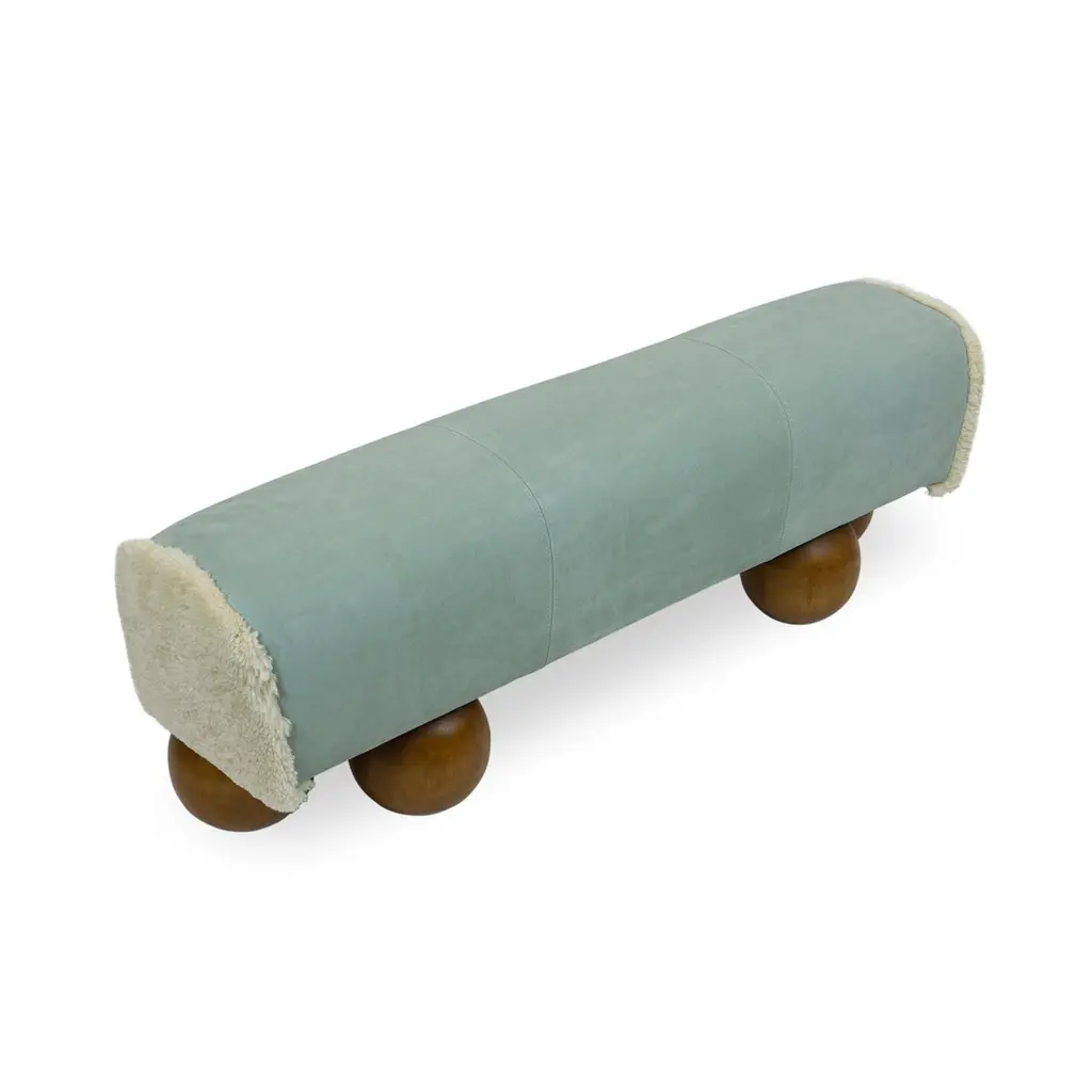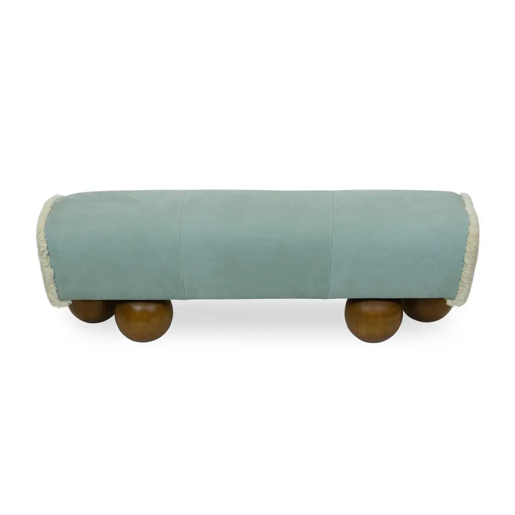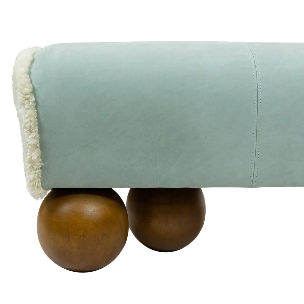 Modern, organic style bench with ball / sphere feet of solid walnut. Saddle shaped seat and upholstered with eight-way hand-tied springs and high density foam. Upholstered with duck egg leather and beige shearling and features top-stitching. Ask us about customizing. Overall: 54”W x 12”D x 18”HSeat Height: 18"Price As Shown: $5,675 eachCOM Price: $4,170 eachCustomization may change the price.How We Work:Made to order by Connecticut-based furniture design and manufacturing company The Tailored Home. Submit your customization desires by 1stdibs messenger for a quote. After orders are placed our workshop manager creates a visual work order for your approval for quality assurance.We accept inspiration photos of pieces you like.2023 - Made to Order9-10 weeks.