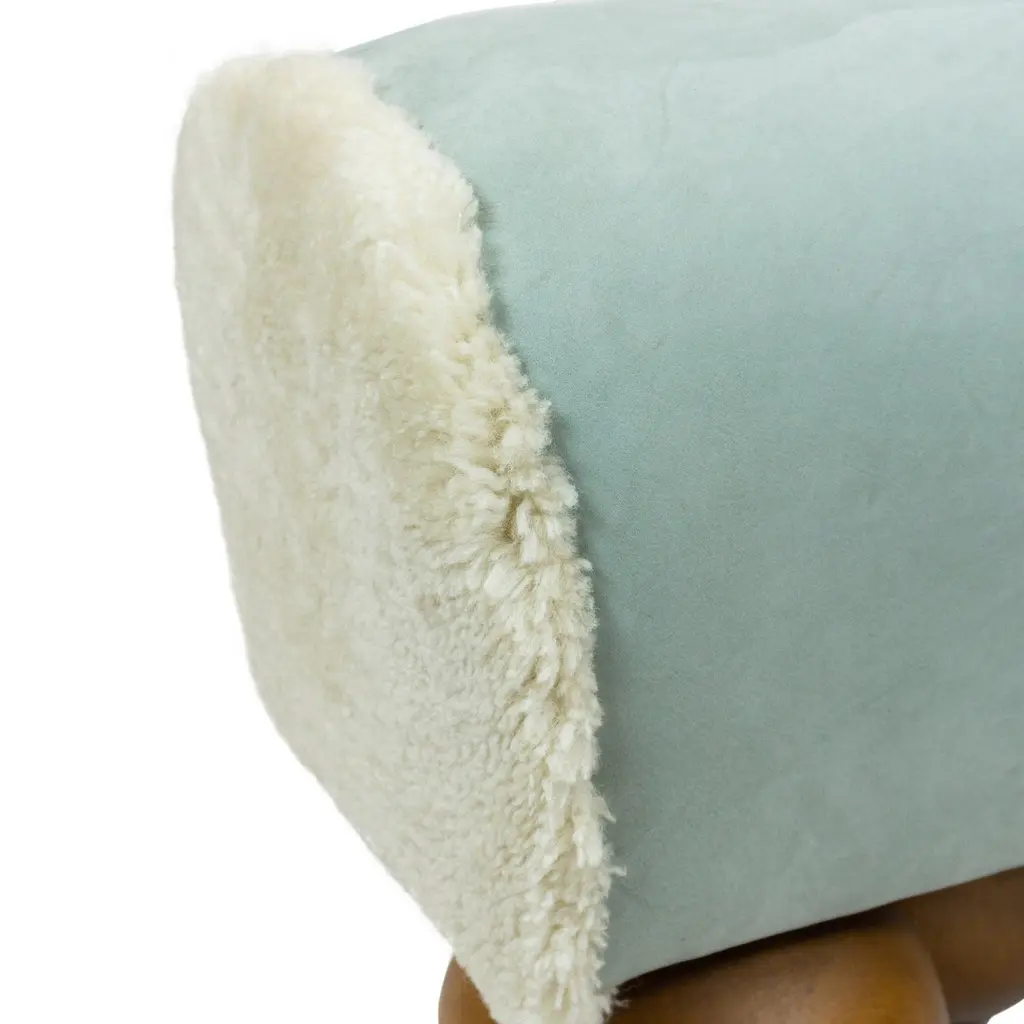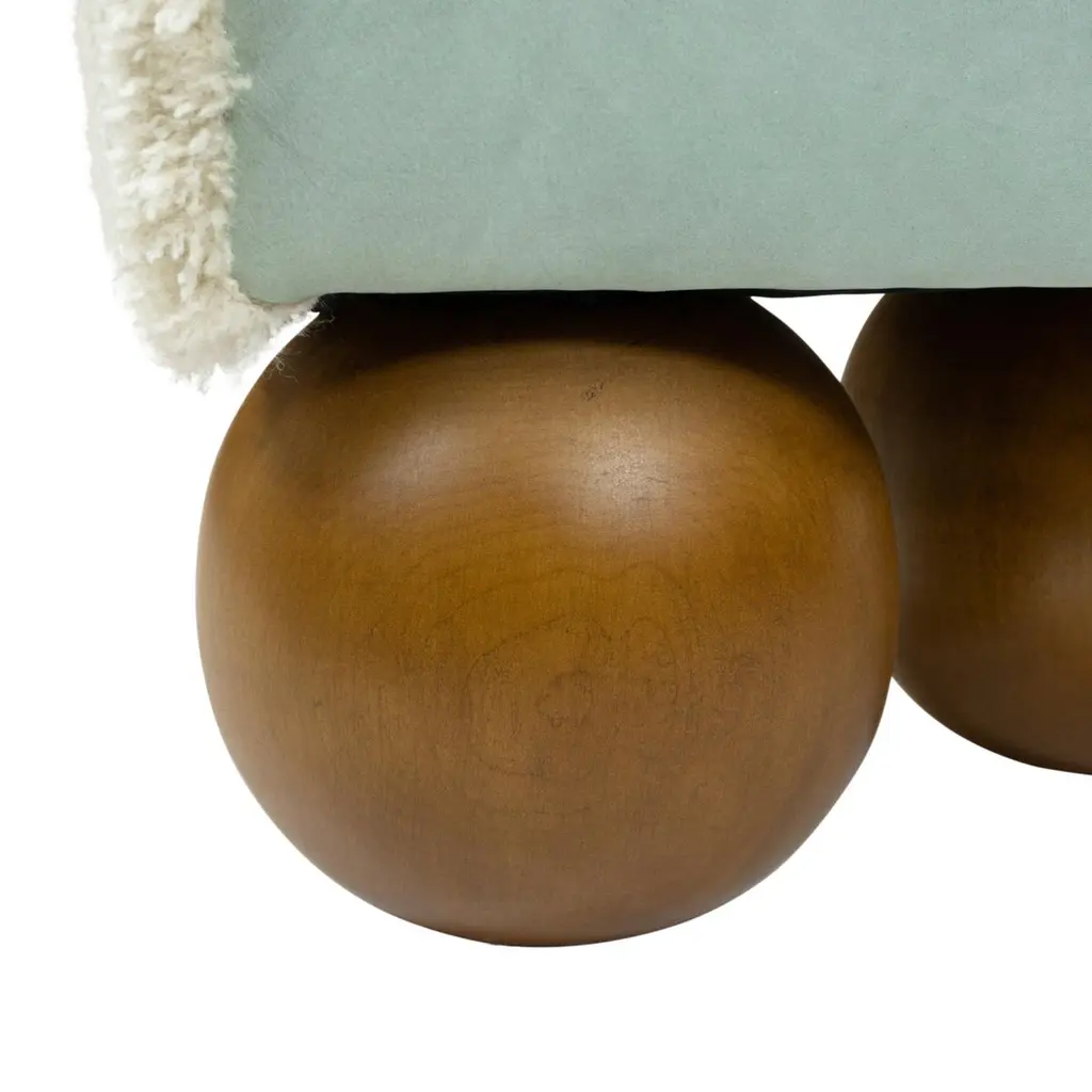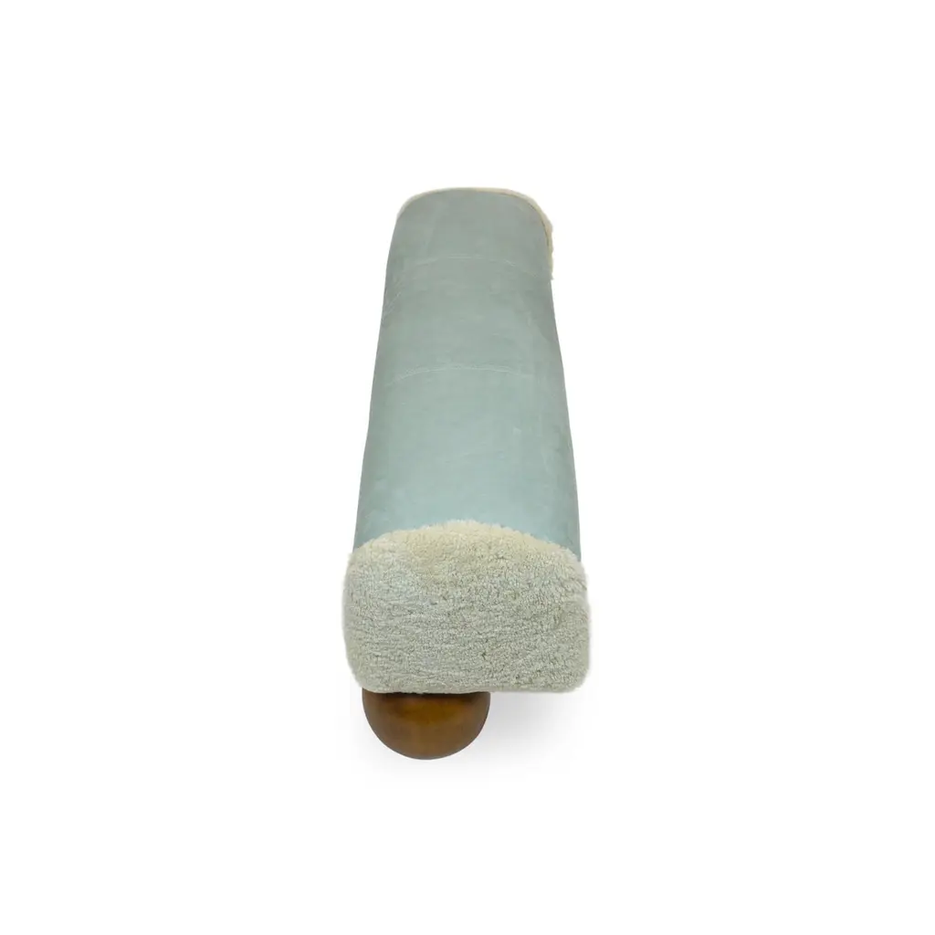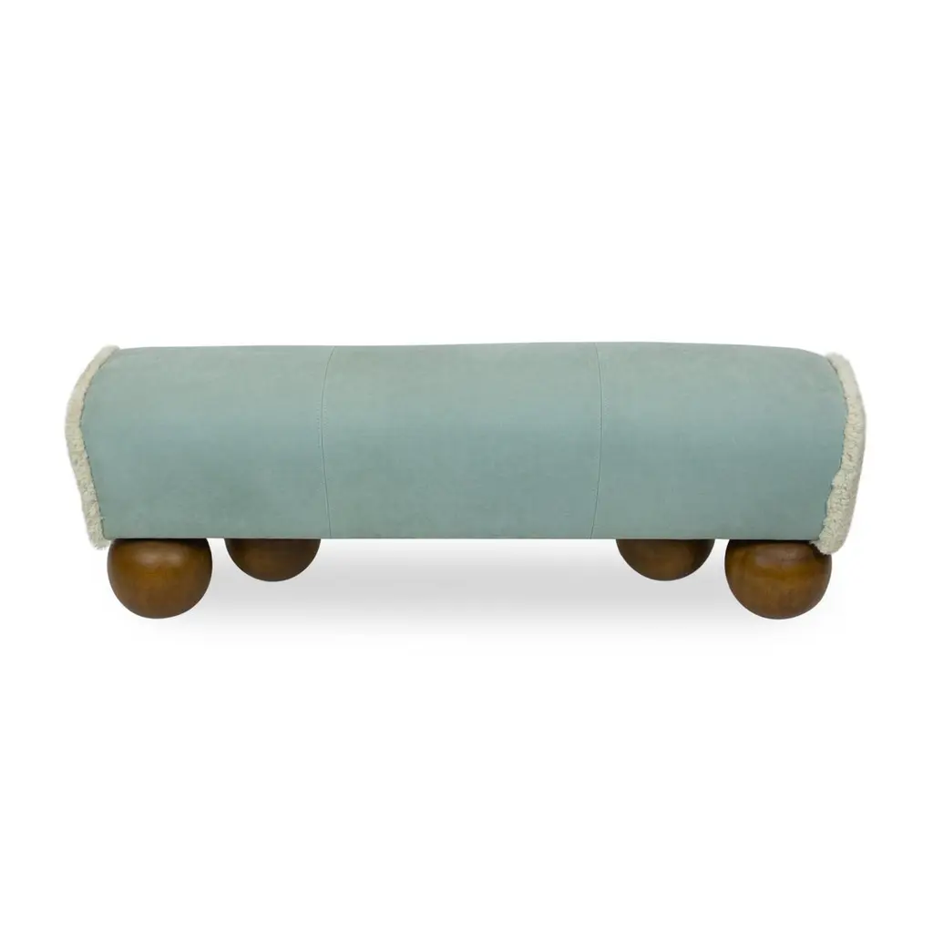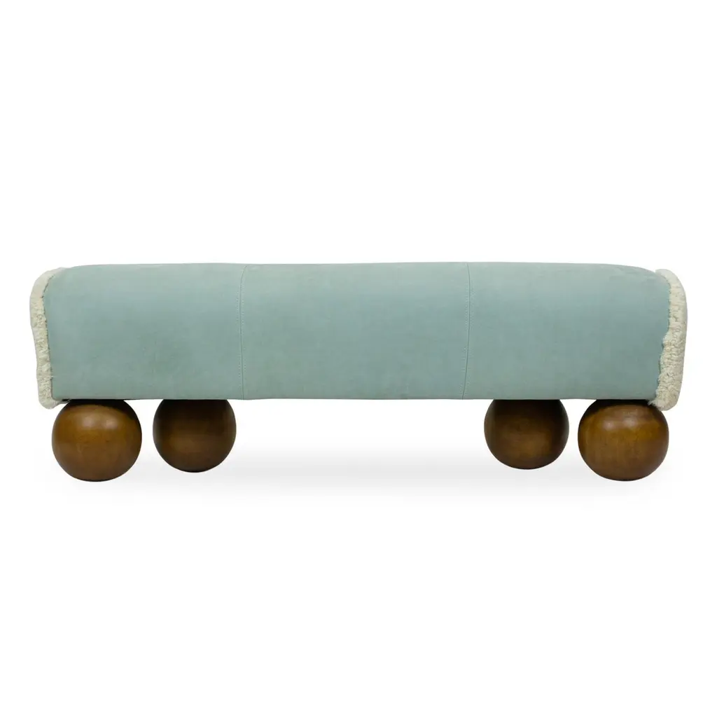 Modern, organic style bench with ball / sphere feet of solid walnut. Saddle shaped seat and upholstered with eight-way hand-tied springs and high density foam. Upholstered with duck egg leather and beige shearling and features top-stitching. Ask us about customizing. Overall: 54”W x 12”D x 18”HSeat Height: 18"Price As Shown: $5,675 eachCOM Price: $4,170 eachCustomization may change the price.How We Work:Made to order by Connecticut-based furniture design and manufacturing company The Tailored Home. Submit your customization desires by 1stdibs messenger for a quote. After orders are placed our workshop manager creates a visual work order for your approval for quality assurance.We accept inspiration photos of pieces you like.2023 - Made to Order9-10 weeks.