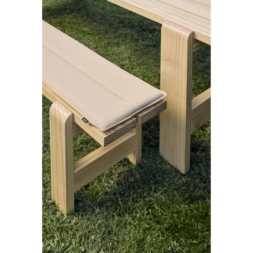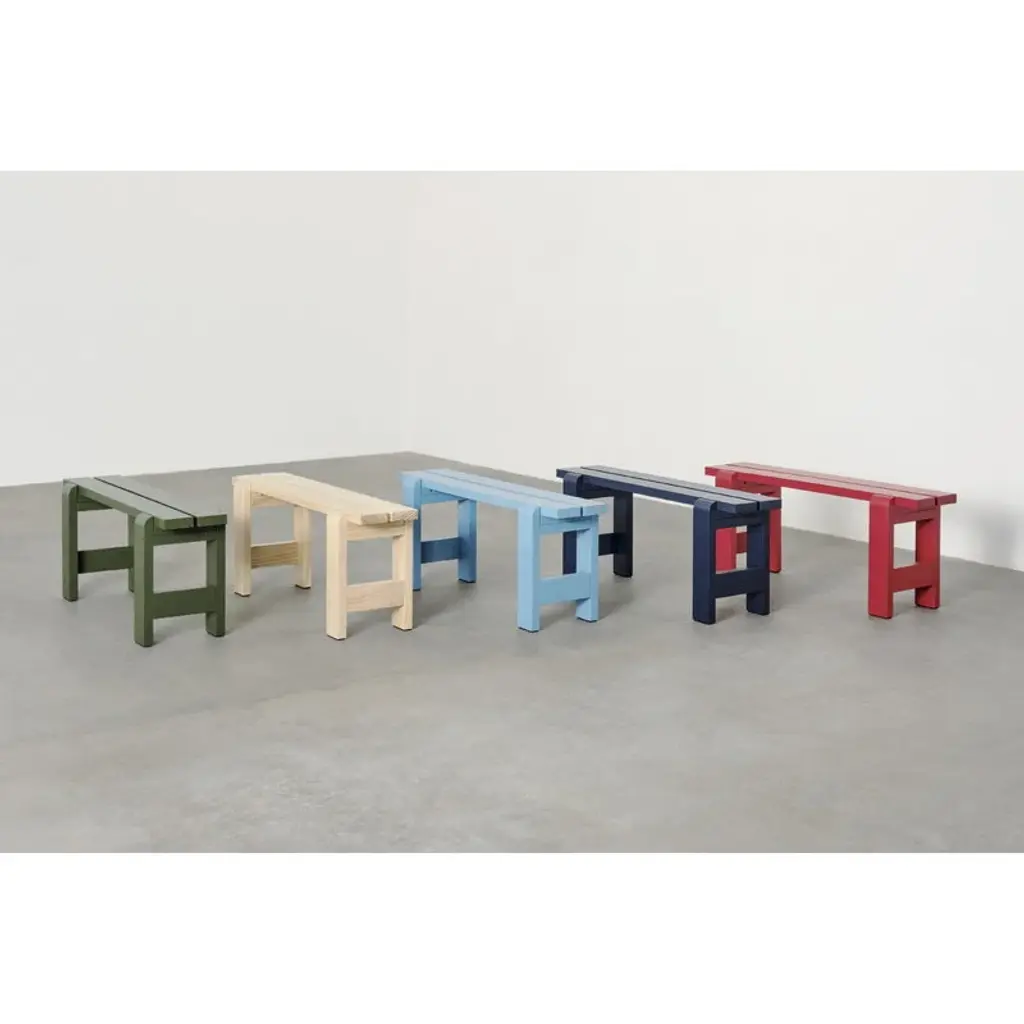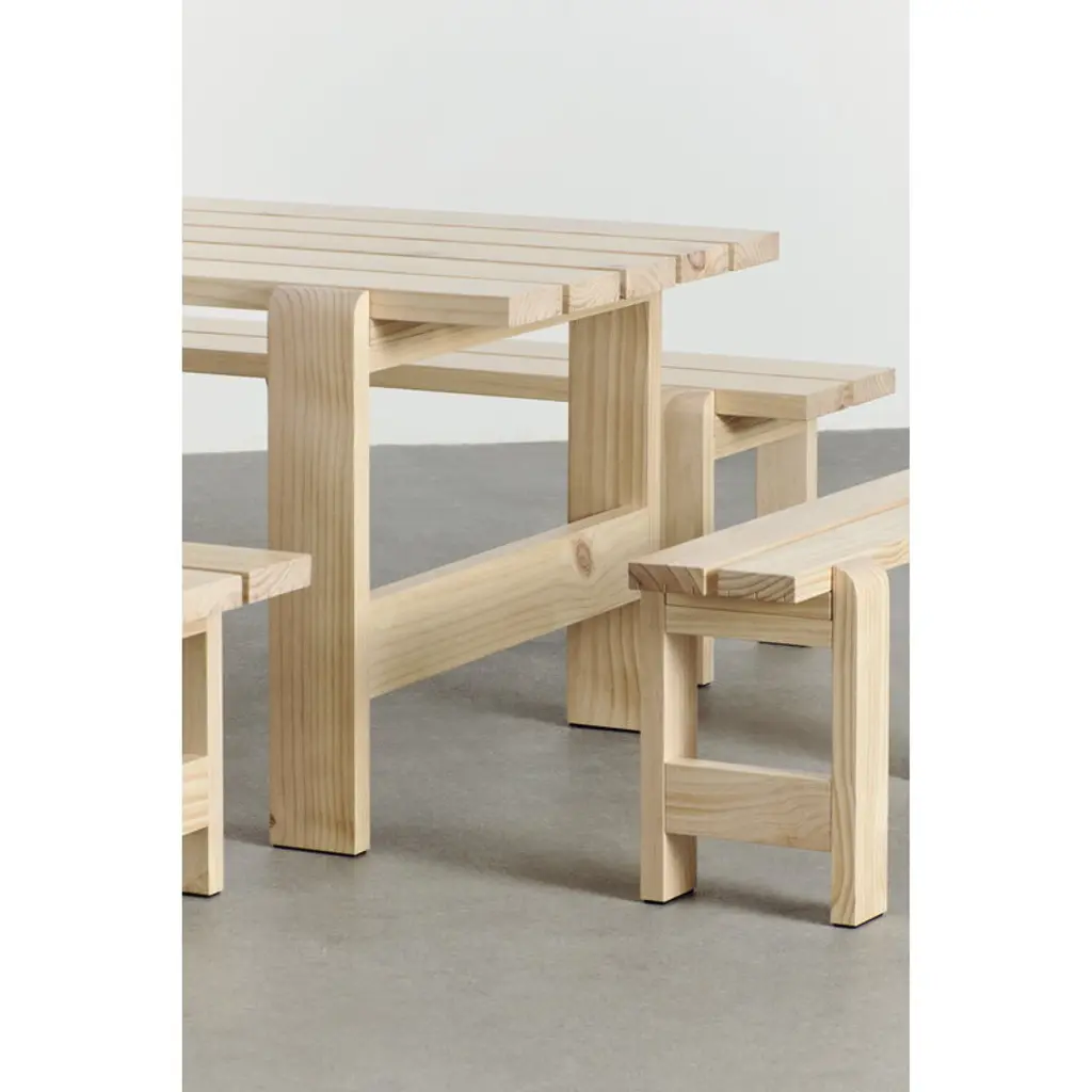 The Weekday bench is part of HAY's collection of pine outdoor furniture. The bench’s recognizable, clean-lined look is a combination of massive legs and a slimmer seat. The bench is a perfect match for the Weekday table of the same design, but its simple look blends seamlessly with other materials and styles as well. The Weekday collection, created by Hannes & Fritz, is inspired by the idea of bringing people together to share both dinner and moments. The weather-proof finished Weekday bench offers a nice spot for taking a moment to sit down and enjoy the fresh air in the garden or on the patio.