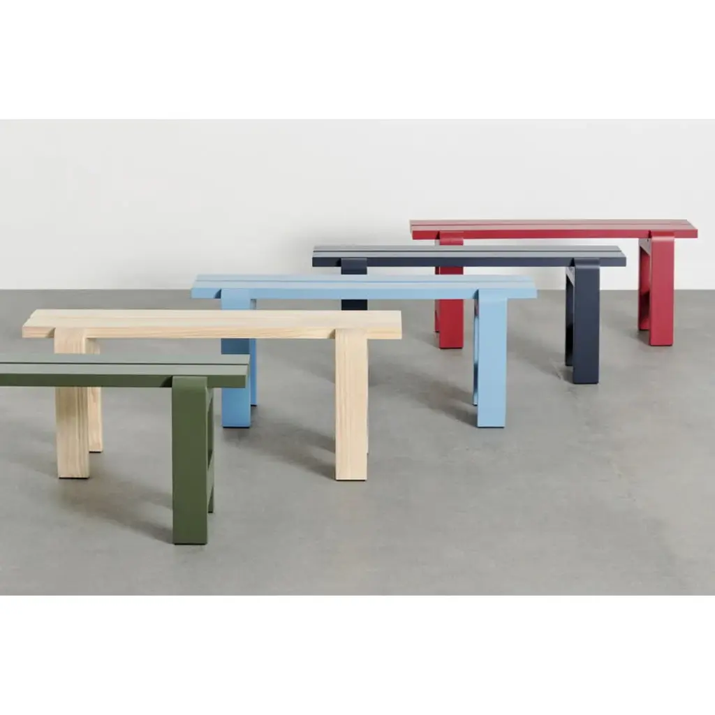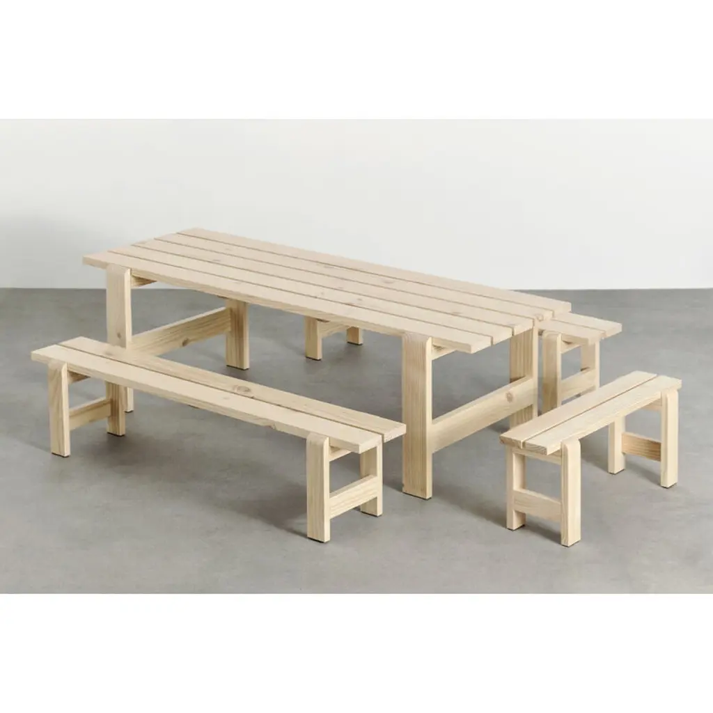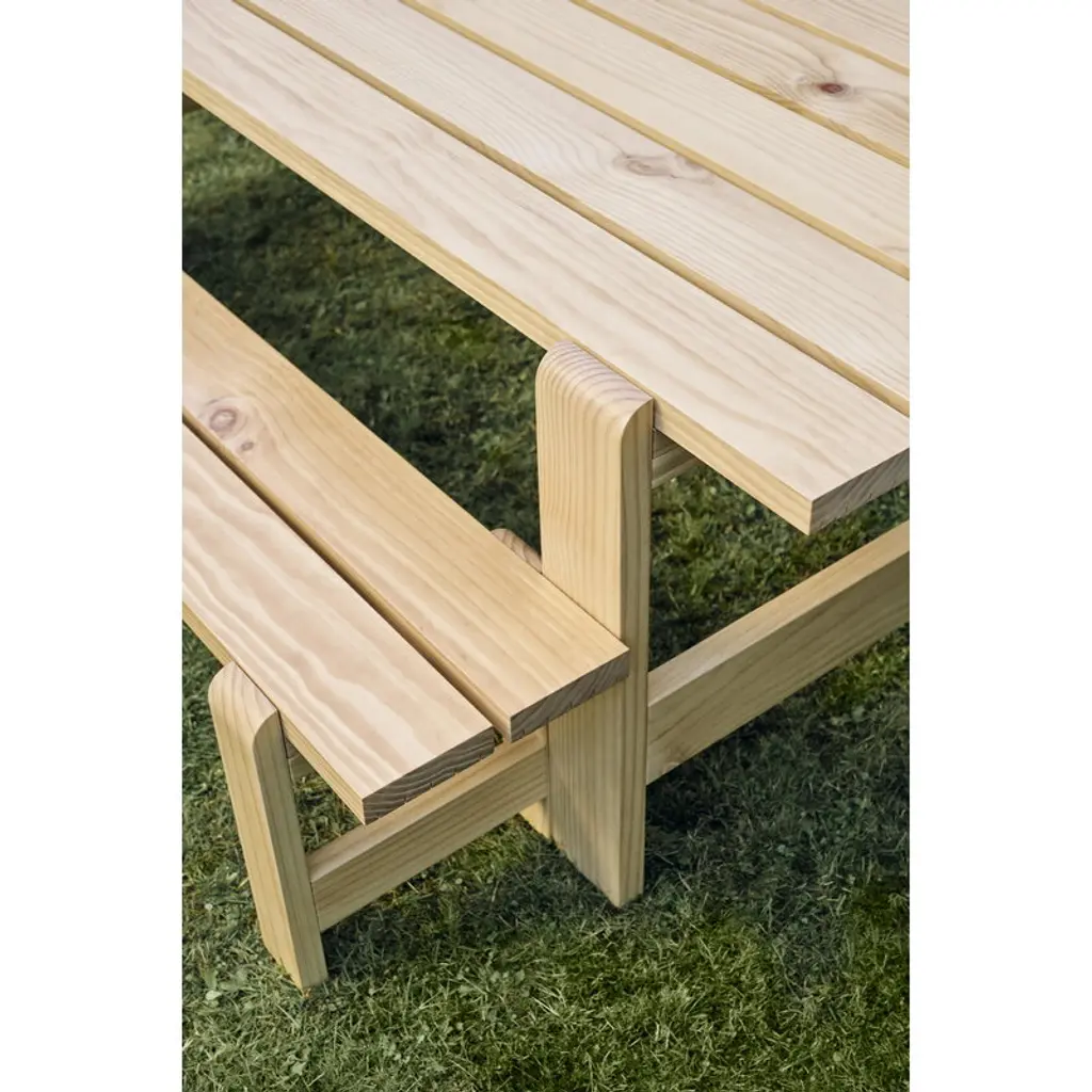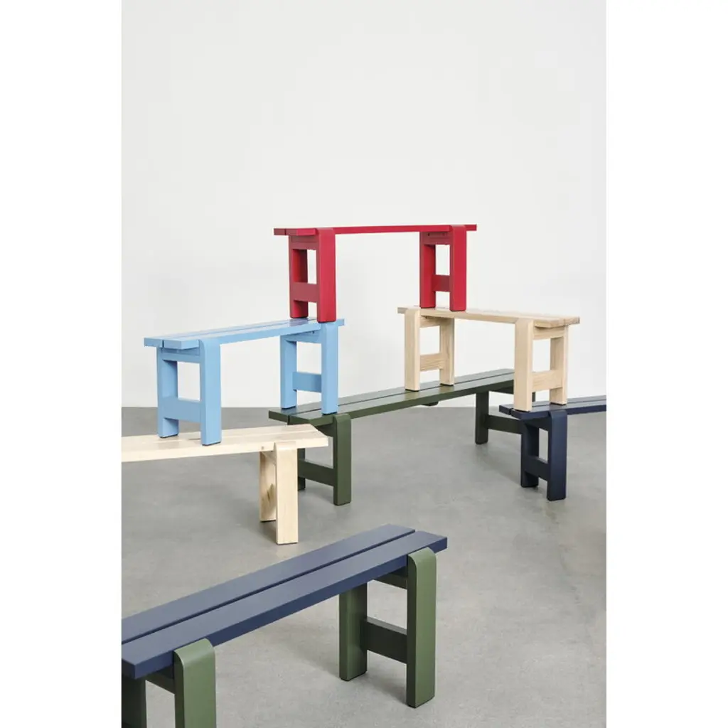 The Weekday bench is part of HAY's collection of pine outdoor furniture. The bench’s recognizable, clean-lined look is a combination of massive legs and a slimmer seat. The bench is a perfect match for the Weekday table of the same design, but its simple look blends seamlessly with other materials and styles as well. The Weekday collection, created by Hannes & Fritz, is inspired by the idea of bringing people together to share both dinner and moments. The weather-proof finished Weekday bench offers a nice spot for taking a moment to sit down and enjoy the fresh air in the garden or on the patio.