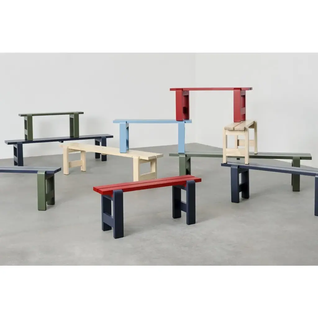 The Weekday Duo bench is part of HAY's collection of pine outdoor furniture. The bench’s clean-lined look is a combination of massive legs and a slimmer seat. To complete the recognizable look, the legs and seat are colored in two different shades – hence the name of the bench, "Duo". The bench is a perfect match for the Weekday table of the same design, but its simple look blends seamlessly with other materials and styles as well. The Weekday collection, created by Hannes & Fritz, is inspired by the idea of bringing people together to share both dinner and moments. The weather-proof finished Weekday bench offers a nice spot for taking a moment to sit down and enjoy the fresh air in the garden or on the patio.