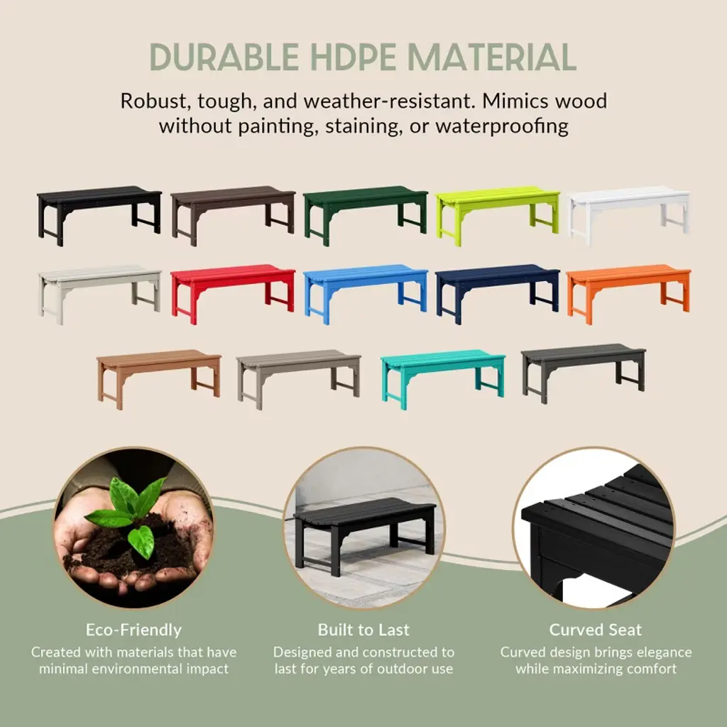 Make your backyard or garden a bit more magical with this amazing bench. Create a place of comfort and relaxation on this 48-inch-long bench, which has a contoured seat that makes it comfortable to sit on for hours. Built to last with HDPE material that reinforces and adds durability, as well as a weather and UV resistant treatment that keeps the vibrant color and material looking new season after season.While we strive to accurately represent product colors, please be aware that actual colors may vary slightly due to individual screen settings and lighting conditions. FeaturesMade with durable weather resistant HDPE constructionUV resistant finish and fade resistant colorsBackless bench with contoured seat for comfortDurable material prevents splinters, cracks, chips, or peelsSimple to assembleAvailable in multiple color options to match your Patio Furniture and outdoor living décorDetails:Product Type: Patio BenchesWhat's Included: (1) BenchBenchDimensions: 46" W x 20" D x 17.75" HWeight: 39.5 lbs.Seat Width: 46"Seat Depth: 20"Seat Height: 17.75"Weight Capacity: 660 lbs.