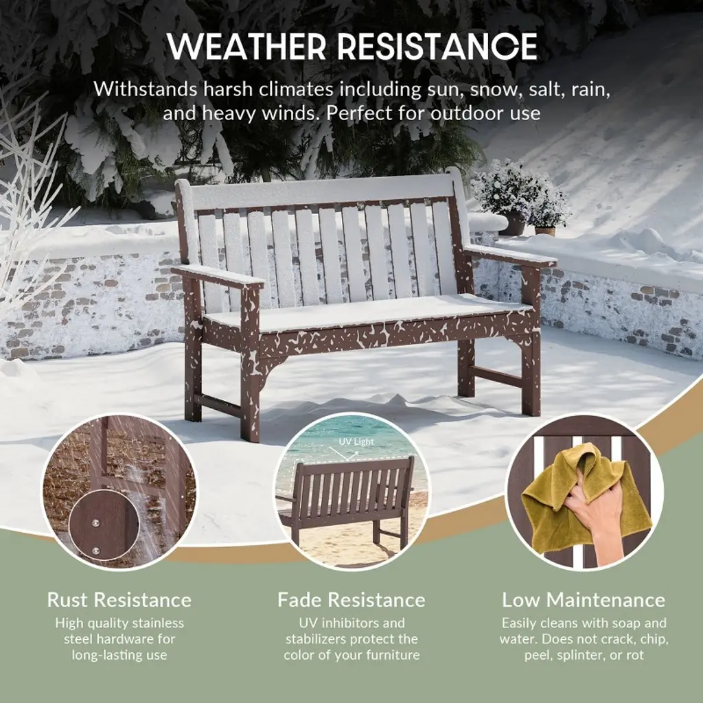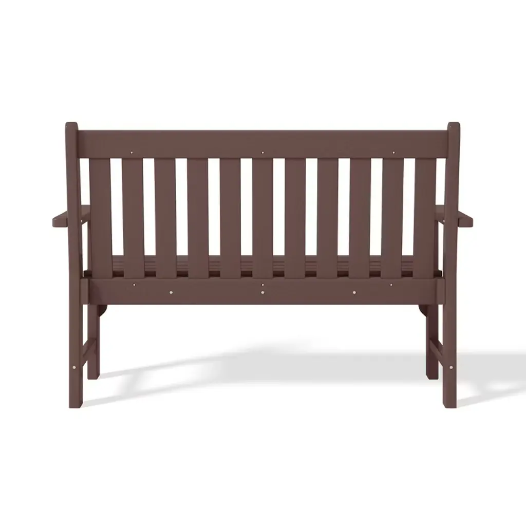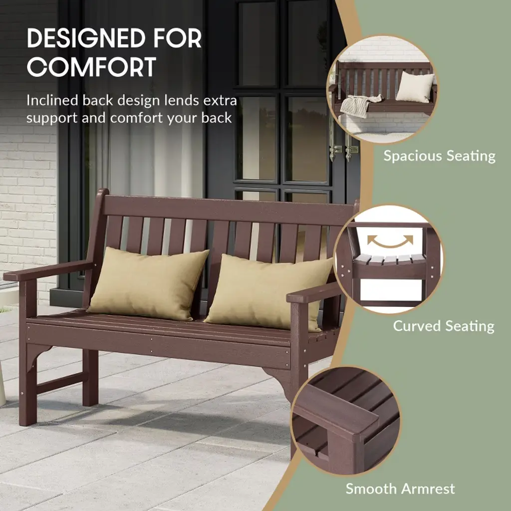 Add style and durability to your front porch with this HDPE garden bench, designed to withstand the elements. Made from high-density polyethylene, it resists fading, cracking, and warping, ensuring long-lasting beauty. The smooth, contoured seat offers comfort for relaxing or socializing. Its classic design and earthy tones complement any outdoor setting. Easy to maintain, this bench is the perfect combination of functionality and timeless appeal.While we strive to accurately represent product colors, please be aware that actual colors may vary slightly due to individual screen settings and lighting conditions. FeaturesConstructed from durable HDPE material and designed to be stable and sturdyWeather resistant to protect against the harsh outdoor elementsFade and UV resistant to protect against the sunReinforced design with the sturdy traingle construction under the front seat to add more durability and hold up to 600lbsContoured seat to relieve tension and a curved backrest that contours to your back for a more comfortable seatCross bar design below the seat for a more stable and durable seatSimple to maintain and clean with a mild soap, luke warm water, and a soft bristle brushDetails:Product Type: Patio BenchesWhat's Included: (1) BenchBenchDimensions: 51" W x 25" D x 34.5" HWeight: 61.75 lbs.Seat Width: 45"Seat Depth: 18"Seat Height: 17"Weight Capacity: 600 lbs.