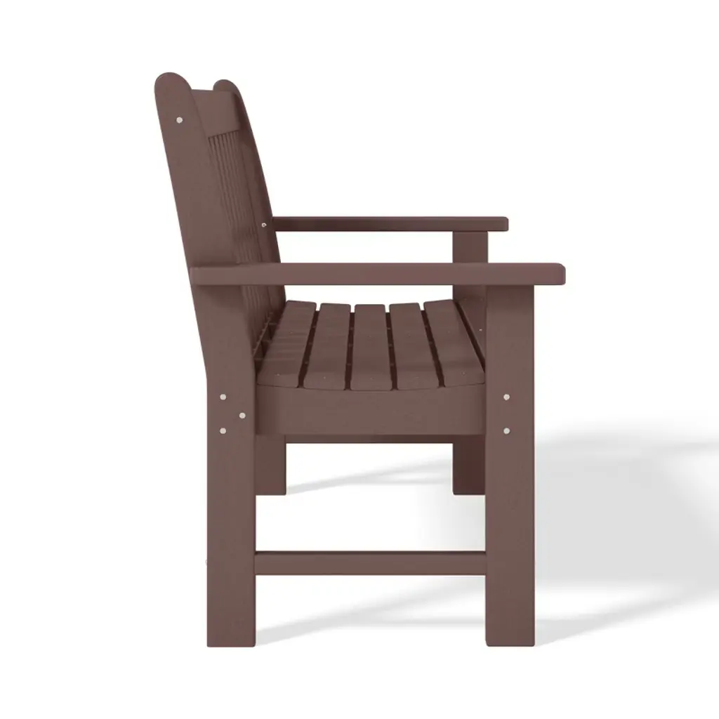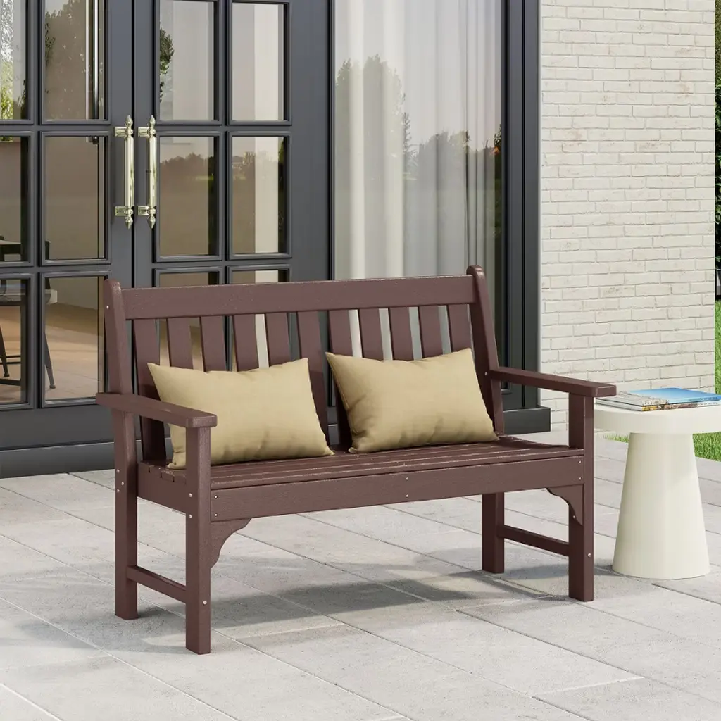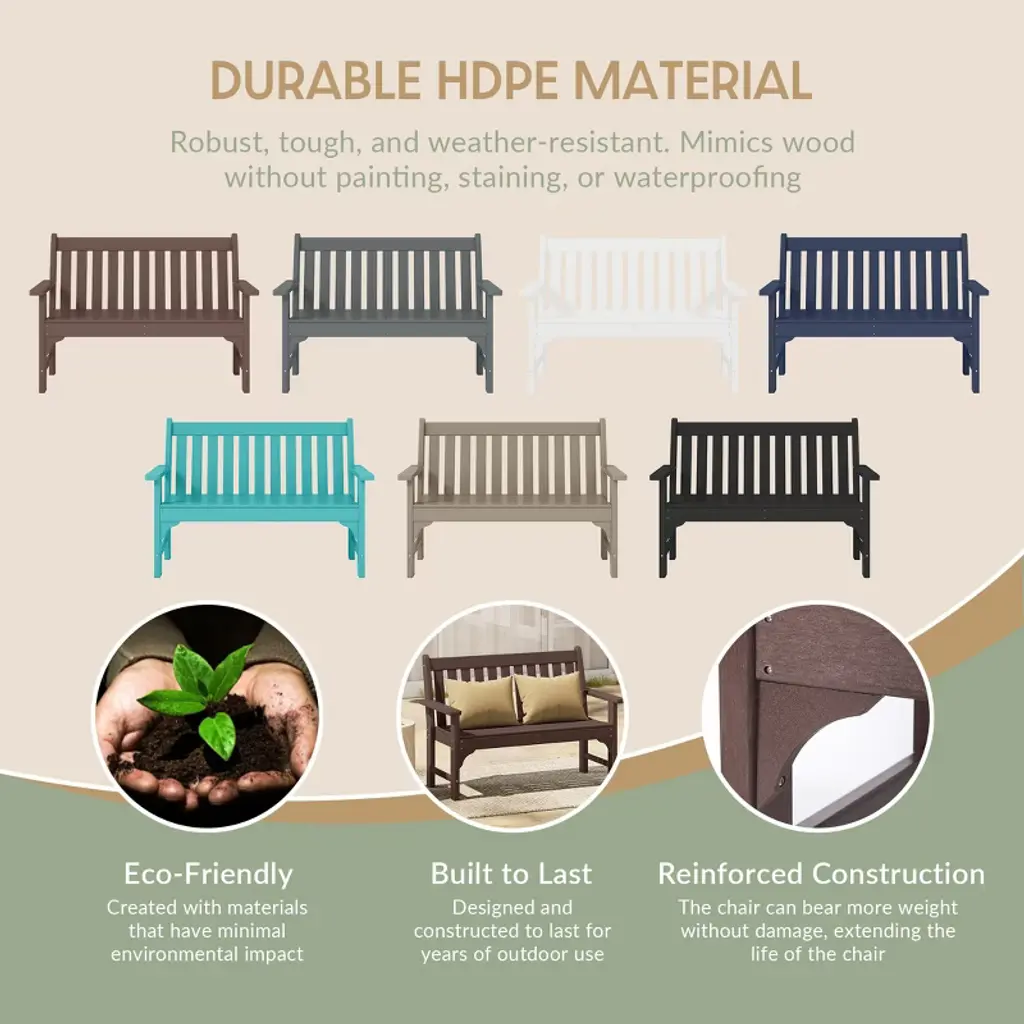Add style and durability to your front porch with this HDPE garden bench, designed to withstand the elements. Made from high-density polyethylene, it resists fading, cracking, and warping, ensuring long-lasting beauty. The smooth, contoured seat offers comfort for relaxing or socializing. Its classic design and earthy tones complement any outdoor setting. Easy to maintain, this bench is the perfect combination of functionality and timeless appeal.While we strive to accurately represent product colors, please be aware that actual colors may vary slightly due to individual screen settings and lighting conditions. FeaturesConstructed from durable HDPE material and designed to be stable and sturdyWeather resistant to protect against the harsh outdoor elementsFade and UV resistant to protect against the sunReinforced design with the sturdy traingle construction under the front seat to add more durability and hold up to 600lbsContoured seat to relieve tension and a curved backrest that contours to your back for a more comfortable seatCross bar design below the seat for a more stable and durable seatSimple to maintain and clean with a mild soap, luke warm water, and a soft bristle brushDetails:Product Type: Patio BenchesWhat's Included: (1) BenchBenchDimensions: 51" W x 25" D x 34.5" HWeight: 61.75 lbs.Seat Width: 45"Seat Depth: 18"Seat Height: 17"Weight Capacity: 600 lbs.