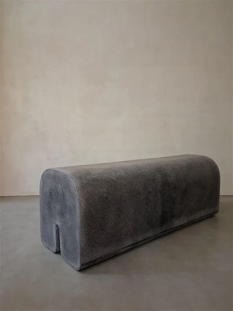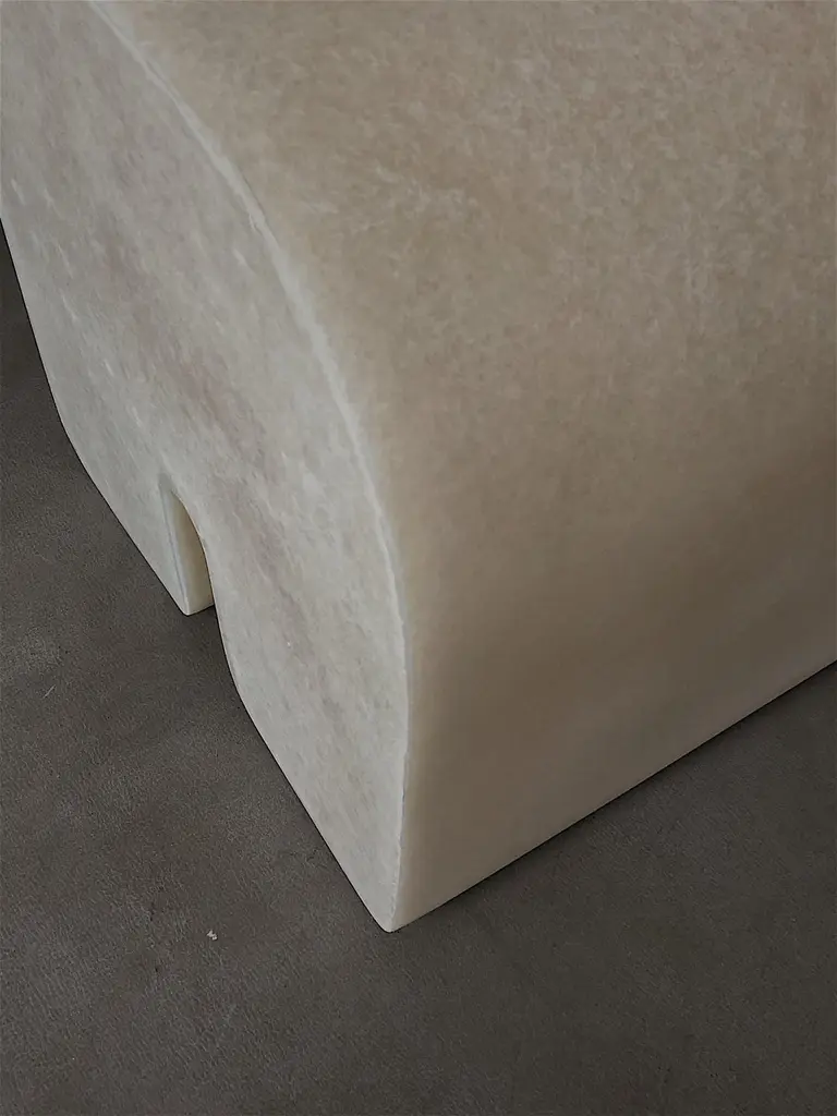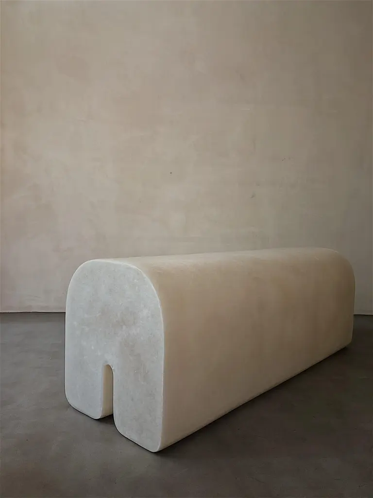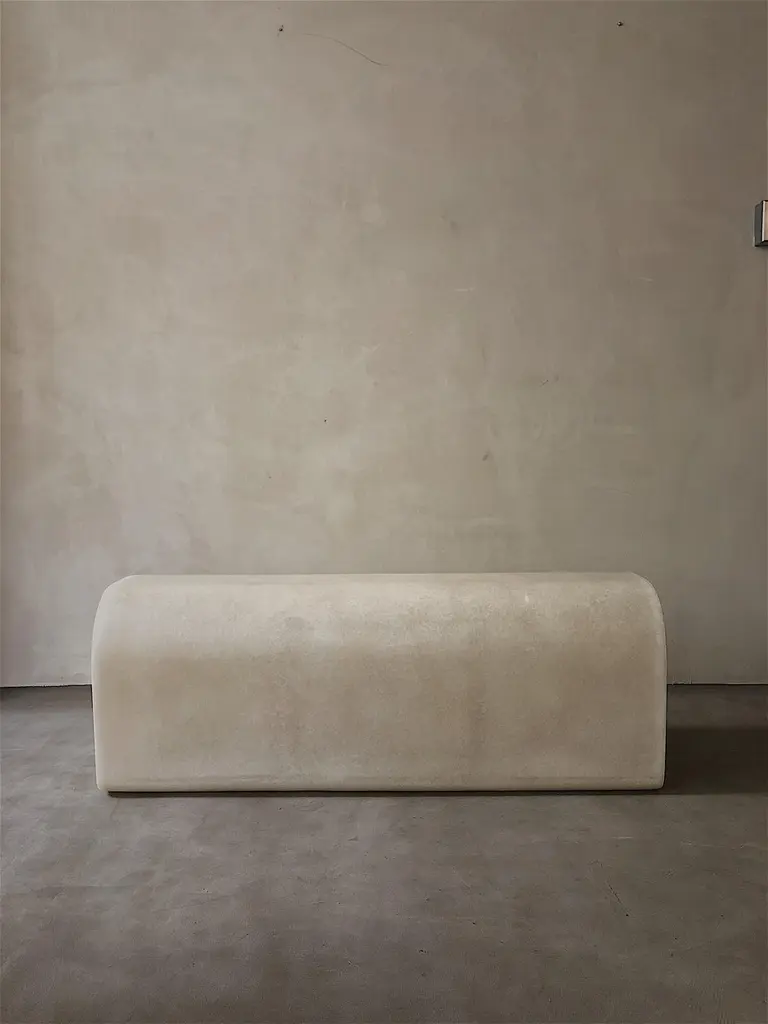White Arch bench by Karstudio.Materials: FRP.Dimensions: 120 x 40 x 43 cm.This piece is suitable for outdoor use.Both display ways make it the focus of the space. It could be laid as a bench, and stand up as a stand for art work.Kar- is the root of Sanskrit Karma, meaning karmic repetition. We seek the cause and effect in aesthetics, inspired from the past, the present, and the future, and we create.The creation journey based on sensibility, we aim to convey emotion through the creation. From the very first kneading, the designer's current emotion, either joy or sorrow, affects the strength and trace on the clay. The overall edges and the lines are ornate and plainness, representing a true emotion, "not my intention".Due to the use of this organic material, the finish will have irregularities, those are not imperfections but part of the visual will of the designers and makers.