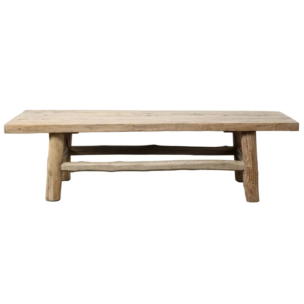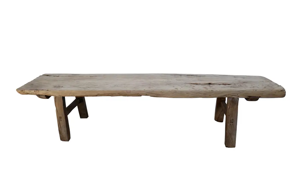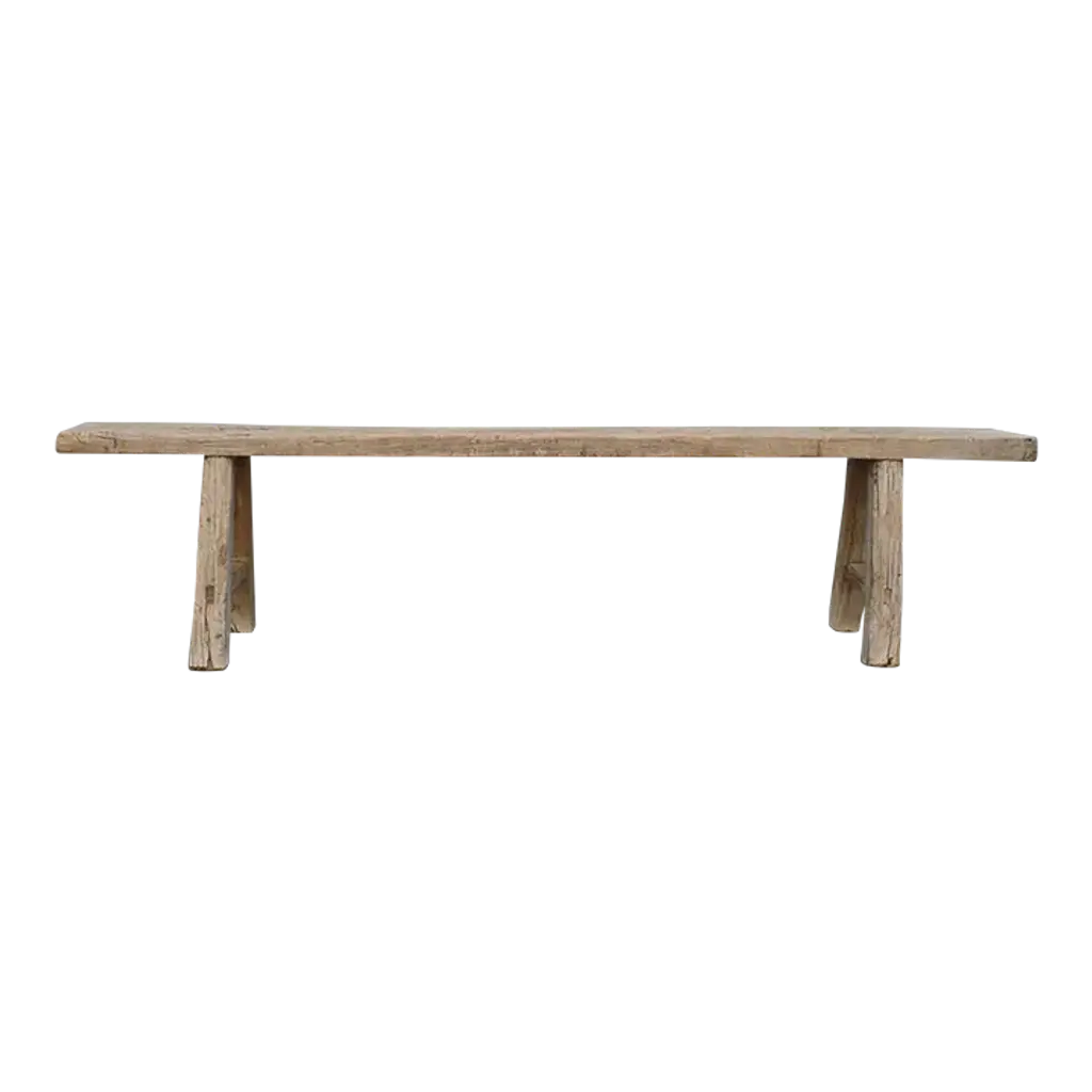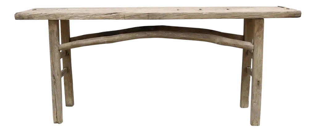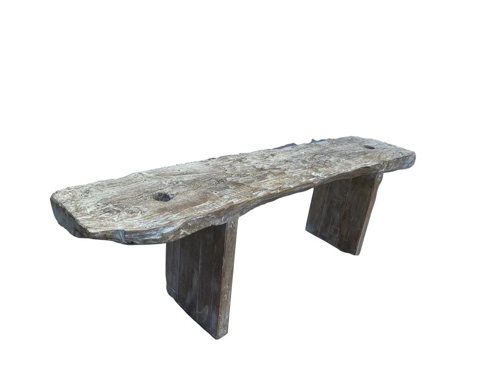 Solid teak bench that has been whitewashed and with live edges and wide plank legs. Each of these is a one of a kind organic rustic piece suitable for indoors or outdoors. The seat is a solid 3" thick plank with beautiful grain detail.