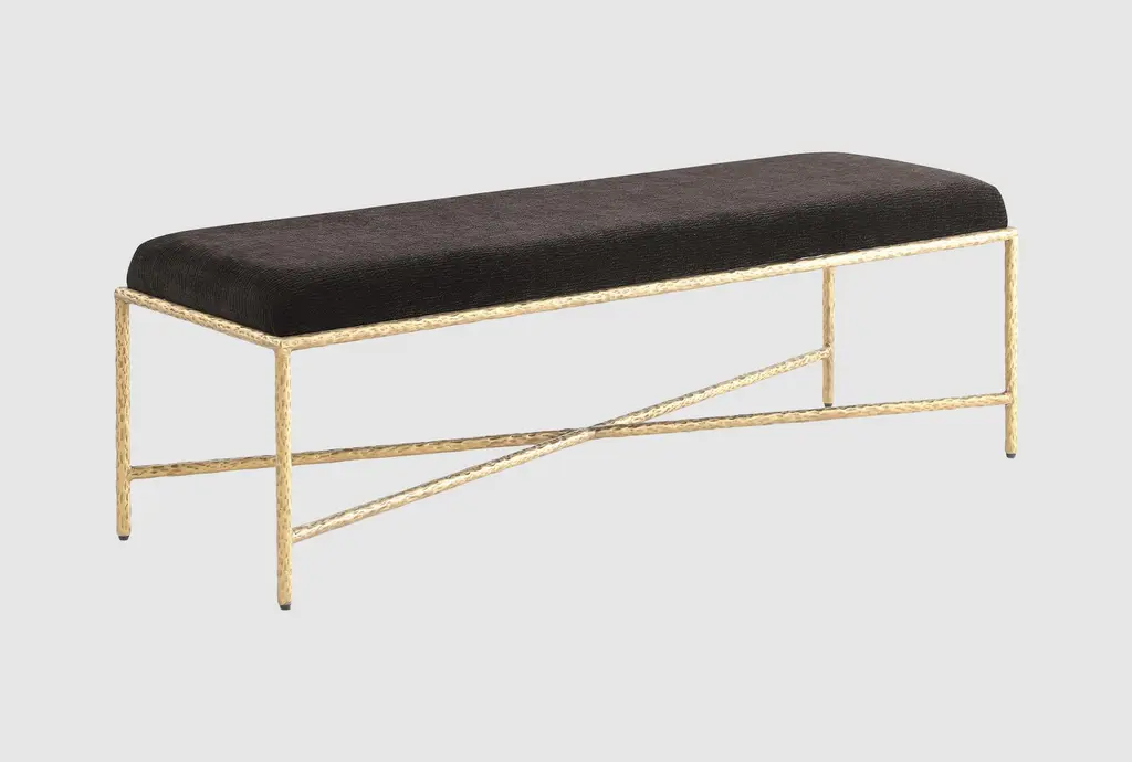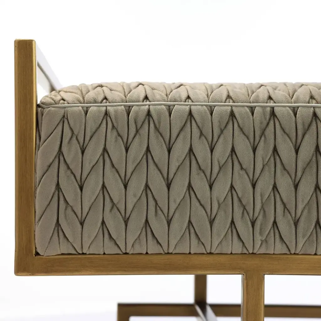 The Wiggins Bench is a stunning seating solution that exudes an aura of sophistication and refinement. The cushion, upholstered in Braid 32 Mushroom 2216 fabric, showcases a tastefully neutral tone and rich textural depth that playfully contrasts the slender steel frame finished in Aztec Gold. Small welt trim in Noble String 2158 fabric adorns the edges of the cushion.