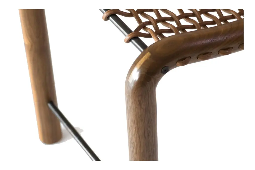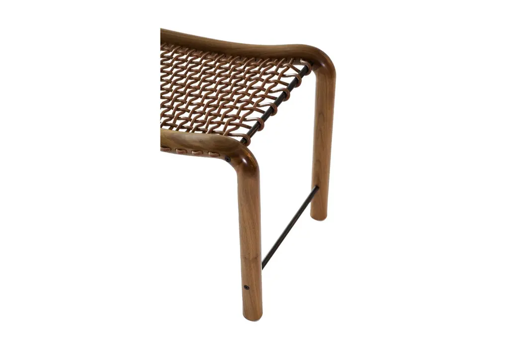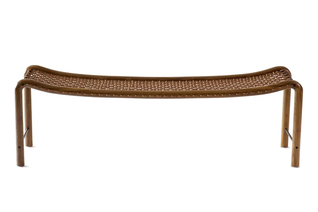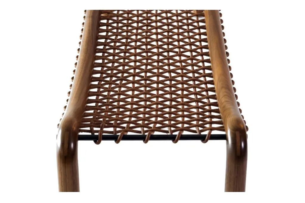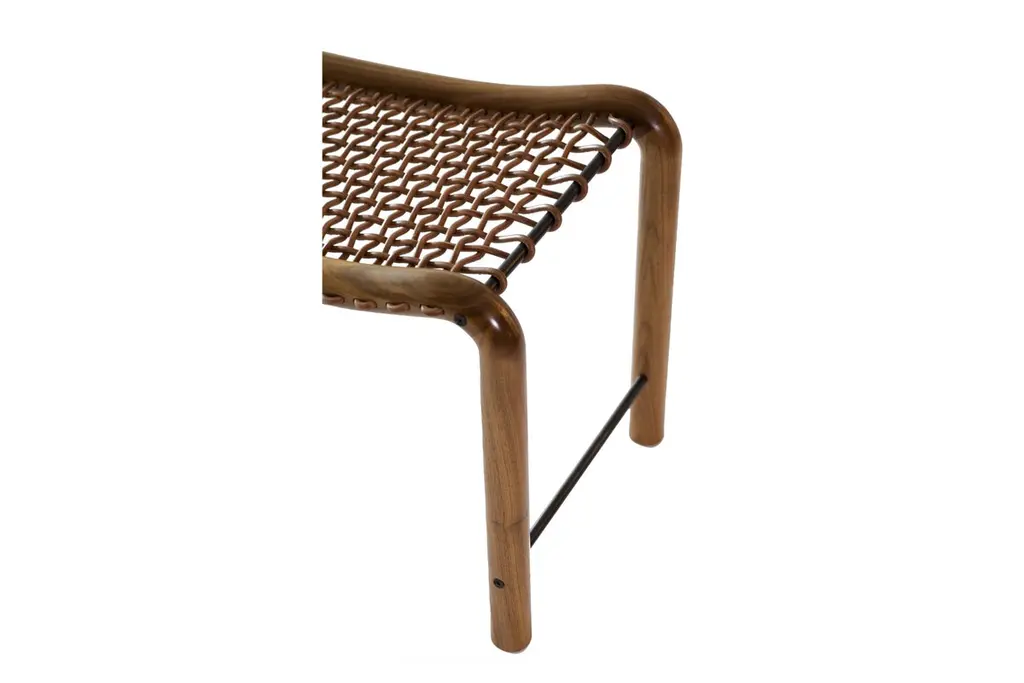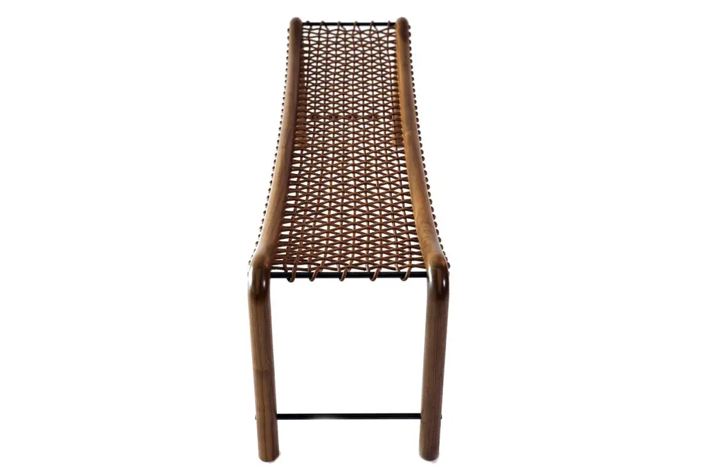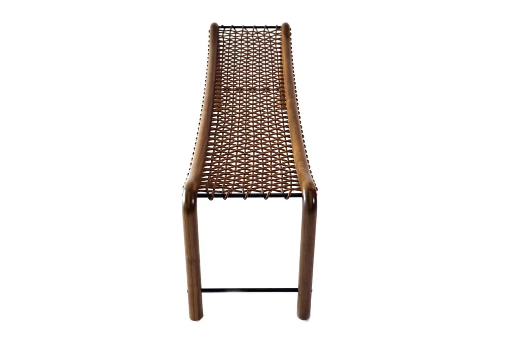 William Emmerson "Ab Ovo' bench with solid bent walnut wood legs, woven leather cording and antiqued bronze stretcher.Elegant undulating shape and exquisite craftsmanship Handmade individually in Los Angeles