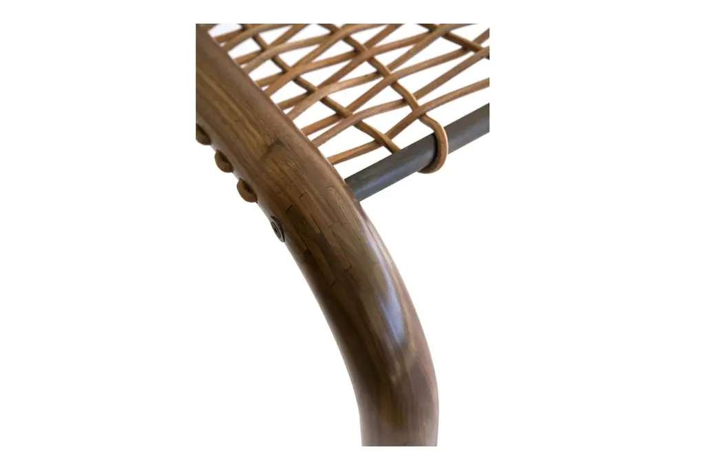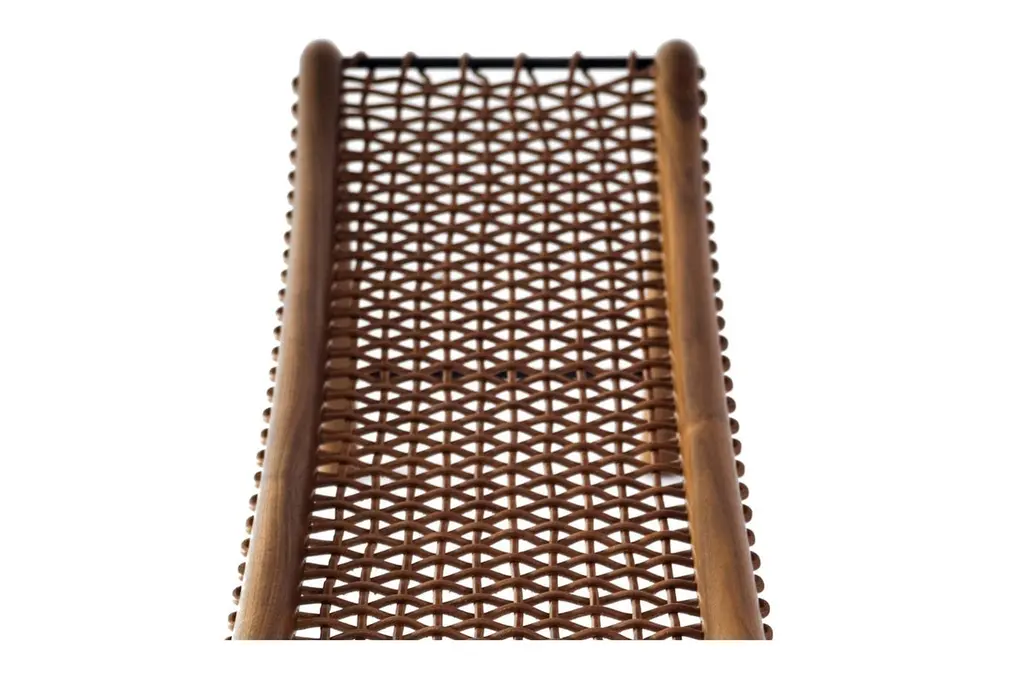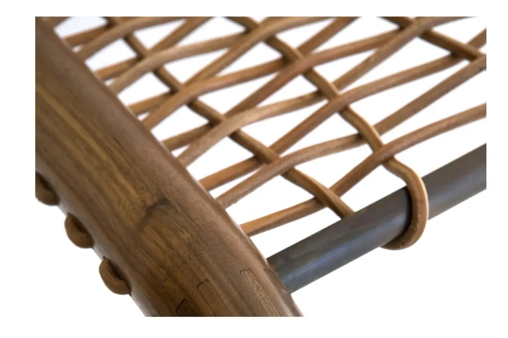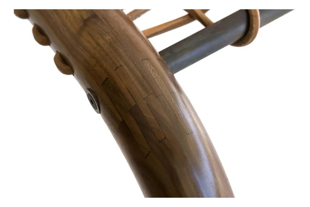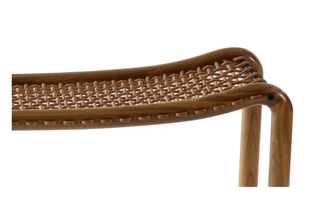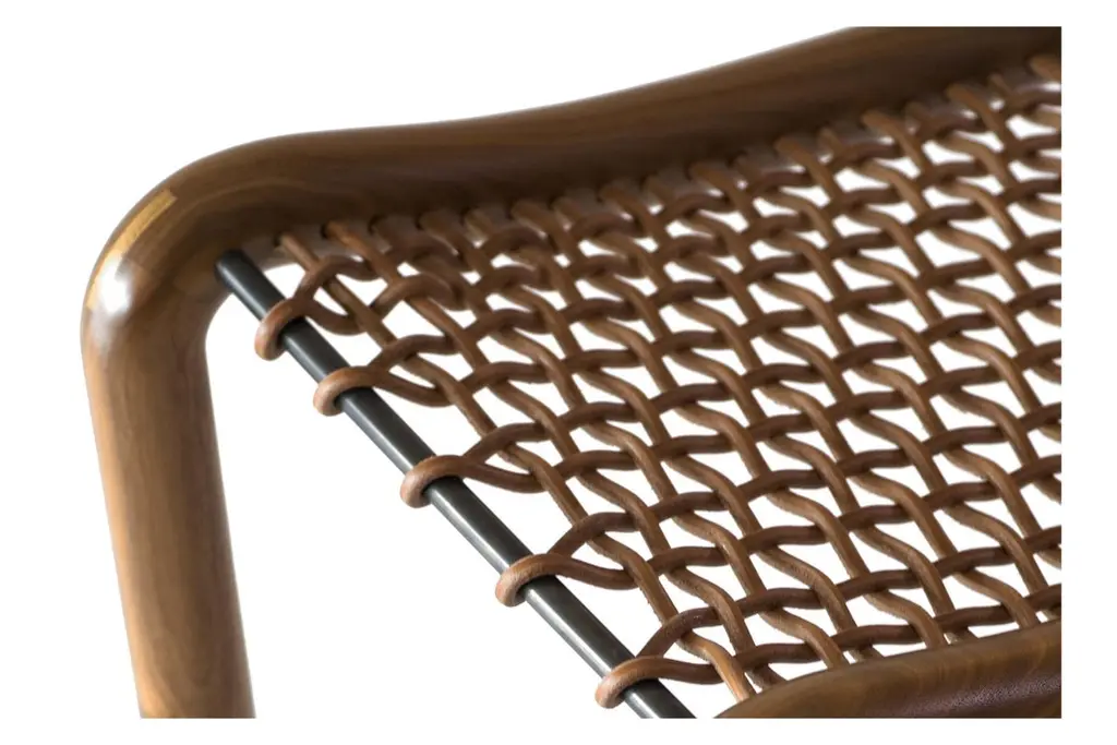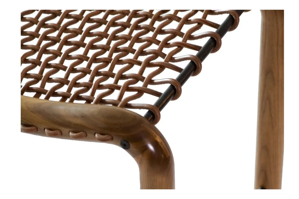 William Emmerson "Ab Ovo' bench with solid bent walnut wood legs, woven leather cording and antiqued bronze stretcher.Elegant undulating shape and exquisite craftsmanship Handmade individually in Los Angeles