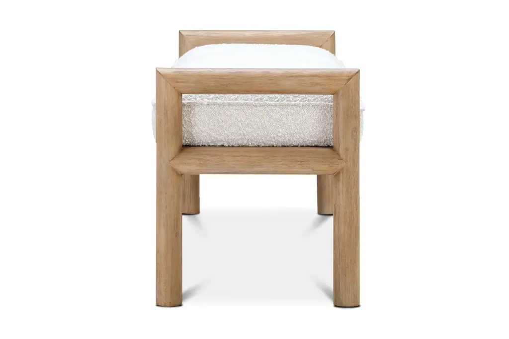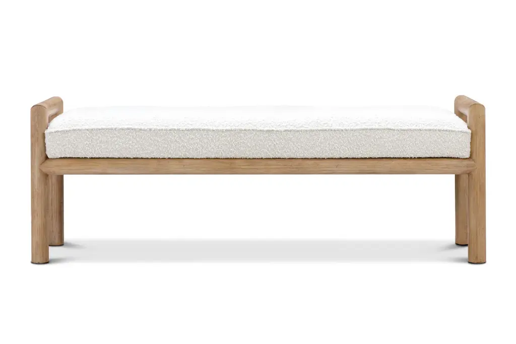 With its rounded posts, low arms, and naturally-finished acacia wood frame, the Winston Bench embraces elements of coastal and transitional design aesthetics to create a cozy, inviting seat. The wood is wire-brushed for a charmingly weathered look, complementing the bench's soft, white boucle seat cushion. This versatile bench warms up any space and can be styled at the foot of your bed, in the hallway, or as extra seating anywhere you need it.