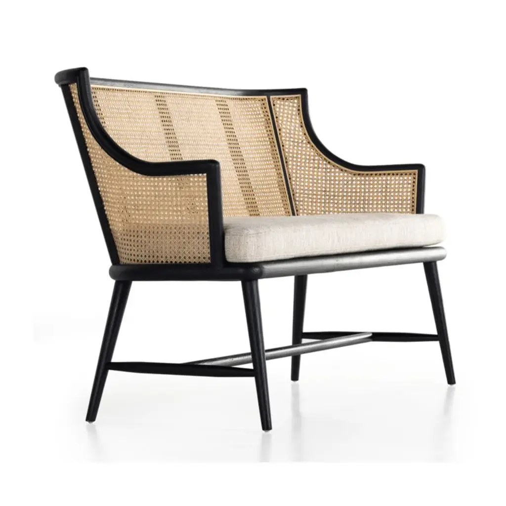 A lovely mix of retro and modern, our Winston bench sits pretty in a dining room, living area or sunroom. Ebony-finished oak structures the elegant frame, from slender, tapered legs to swooping arms to the high, spindled back. Woven cane lightens the look, while a removable cushion upholstered in a decor-friendly neutral ensures a comfortable sit.