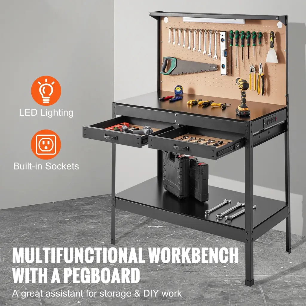 Stable Solid Wood Construction: Crafted from heavy-duty carbon steel, our workbench features a solid wood work surface and multiple crossbeams, ensuring a stable structure that keeps you steady and focused. Say goodbye to wobbling and distractions, and work with confidence. Impressive Weight-Bearing Capacity: Equipped with fixed rubber feet, our workbench adapts to uneven surfaces, providing slip resistance and leveling support. It can support an astounding weight of up to 2000lbs/220lbs, equivalent to the weight of 50 5-gallon water buckets. It's built to handle heavy-duty tasks effortlessly. Adjustable Height for Customization: With 10 height adjustment holes, easily accessible and adjustable by hand—no tools required—you can set the workbench to your desired height. Experience enhanced comfort and convenience as you work, tailored to your specific needs. User-Friendly Features: Our workbench is equipped with a 14W LED light for optimal illumination. The embedded power panel features four AC outlets and two USB ports, providing convenient access to power. With a generous 126" cable, you'll have ample reach for both lighting and powering your tools. Efficient Storage Solutions: To keep your tools organized, we provide 30 hanging hooks, along with a perforated pegboard and drawers. This comprehensive storage setup ensures that all your tools are neatly arranged and easily accessible, promoting a streamlined workflow and enabling you to work efficiently. Package Content 1 x Adjustable Workbench 30 x Hooks (15 x Long Hooks, 15 x Short Hooks) 1 x Manual 20 x M8*12 Bolts 12 x M8 Nuts 8 x M8*50 Bolts 16+2 x Screws 26 x M5 Nuts 1 x 5# Hexagon Bar (1 x Workbench 30 x Hooks 1 x Manual 14 x M6*16 Bolts 14 x M6 Nuts 12 x M4*12 Bolts 12 x M4 Nuts 4 x Rubber feet) for 220lbs option