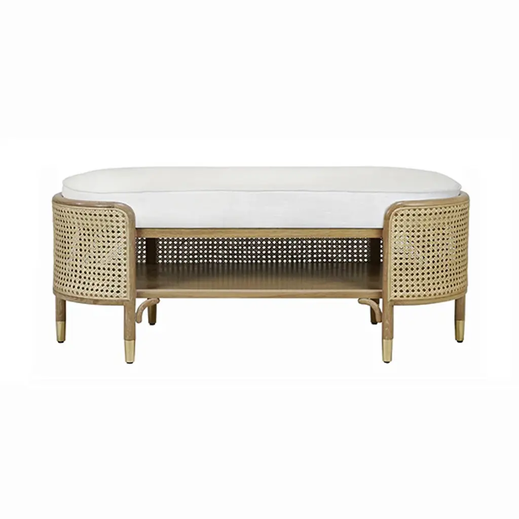 Our Colonial-style Beale oval bench offers a unique seating and storage solution in an elegant, shapely silhouette. The natural woven cane panels are framed in matte white or cerused oak, giving Beale an air of sophistication. Topped with a plush white linen cushion and finished with brass ferrules, Beale is both comfortable and stylish.