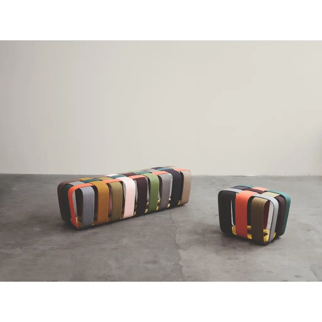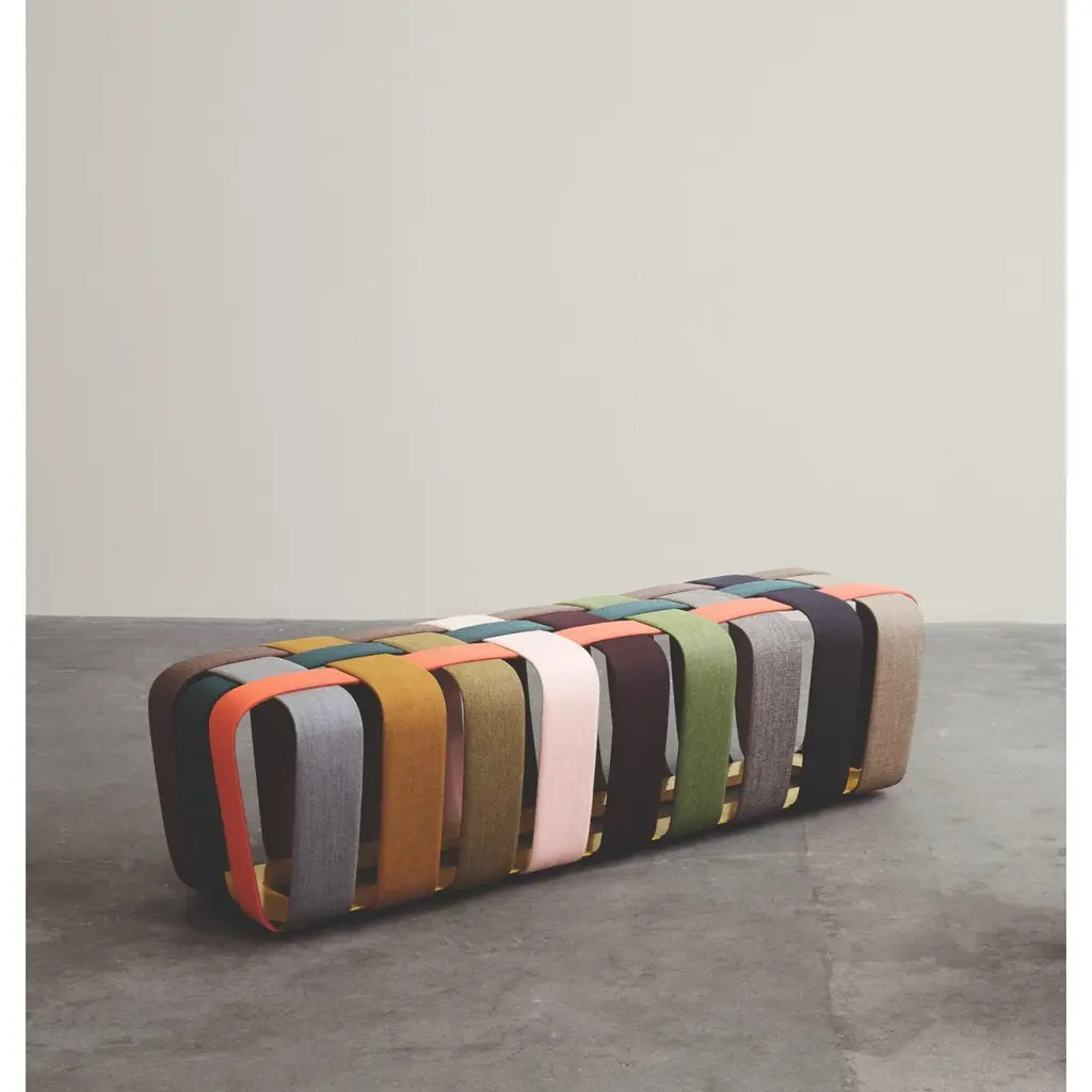 Woven Long Bench 190 by Max LipseyDimensions: D 54 x W 190 x H 46 cm.Materials: Steel, Kvadrat canvas, and fabric.Custom with Kvadrat Canvas and RAL colors. Custom lengths in 20cm increments. Please contact us. Woven Bench is the result of a close study of the Canvas textile. Zooming in and looking very closely at Canvas, I became intrigued by the strength that weaving imparts to the fine wool fibres, the tactile quality, and the optical effects of the unexpected colour combinations. I particularly wanted to explore the paradox of soft yet strong qualities that result from weaving. The idea of ‘soft strength’ at first seems contradictory or silly. But I’m reminded of the saying, ‘The wind does not break a tree that bends’: simple wisdom, and a more effective approach than reliance on strength alone.I work a lot with steel and was attracted to the idea of adding a ‘soft’ quality to the strength of steel: steel and softness have quite contrary associations. Using steel strips instead of threads, I scaled up the weave of the Canvas. At this size – two millimetres wide – steel strips are rather flimsy. The longest ones, over three metres, are barely able to support their weight. The structure produced in weaving them together brings a spring-like tension to the bench, allowing it to support a body with just a bit of soft give. Cladding each strip in a different colour of the Canvas textile adds to the feeling of softness: a surprising one for a steel bench.Atelier Max Lipsey is the workshop of Max Lipsey, an American designer based in Eindhoven, The Netherlands.After receiving a BA at New York University, he graduated from the Design Academy Eindhoven Bachelors in 2007. His studio, since 2008, has been a personal platform to develop and self-produce his designs, work with companies on mass production, and reach out to initiate group projects.Max's work follows his fascinations with nature, material, craft, history, and making…and translating these fascinations into an object. After an intellectually based education in the US, Max has been delving into a more intuitive, hands-on way of working...letting his ideas come from interactions with material and observations at the moment rather than an intellectual structure. Through this way of working, he strives to find more authentic, surprising ideas.Max's biggest design goal is to challenge what we make industrially to be more spontaneous and vital.