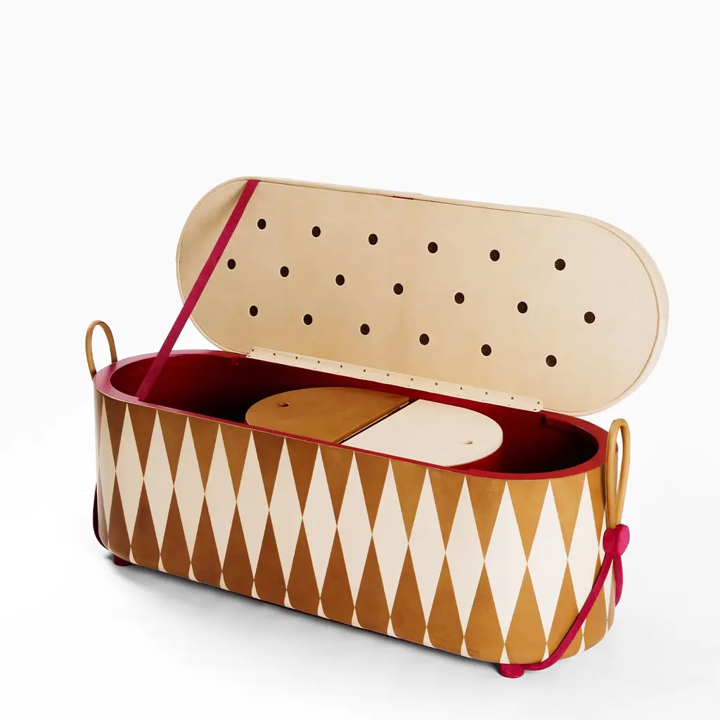 Discover the limited edition ""Wunderbrust" bench by Matteo Cibic, crafted by DOC that by lifting the lid can be used as a storage space. He started to play with the idea of a trunk, seeing it as a timeless object which is passed along in a family. Using the most natural leather as a canvas, he applied color and a pattern with his signature humor the chest is entirely handmade, crafted in natural leather and chamois, thus subjected to changes through time.