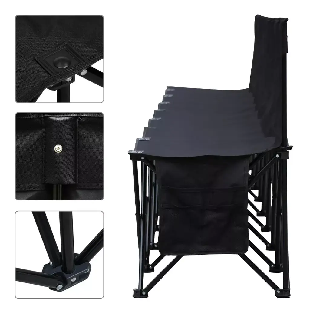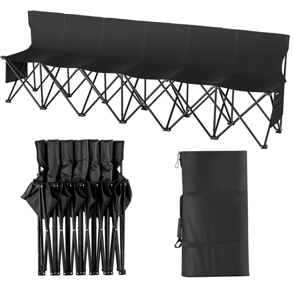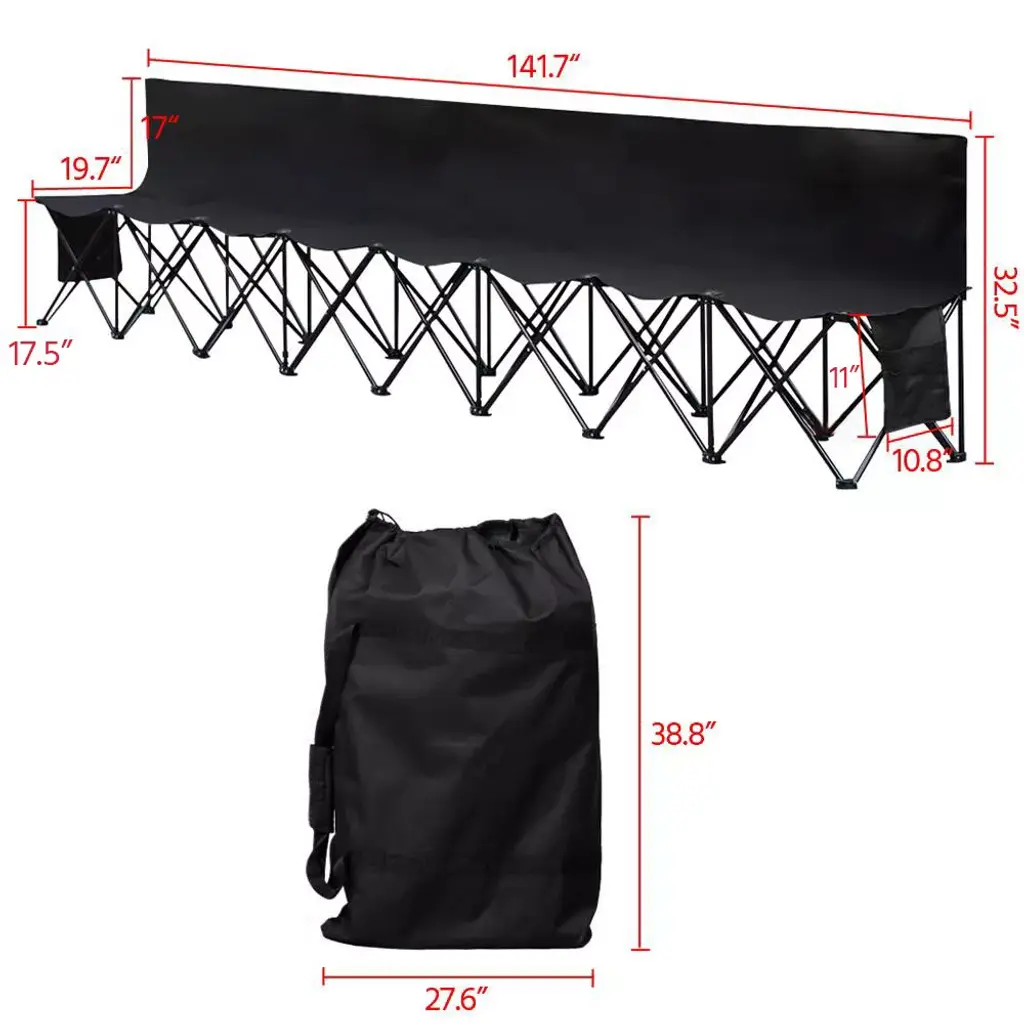 This 8-seat game bench is designed for game, camping and any other outdoor activities. Comes with a carry bag, this camping folding bench is super convenient to easy to carry and transport. The provided backrest offer strong support for your back, allowing you to enjoy the game as relaxed as possible. Specifications: Material: Oxford & IronSize: 141.7 x 19.7 x 32.5" (L x W x H)Side Bag Size: 11 x 10.8" (L x W)Seat height: 17.5"Back height: 17"Color: Black, BlueWeight Capacity: 220 lb for each person each seatPlease see the image for exact measurements.