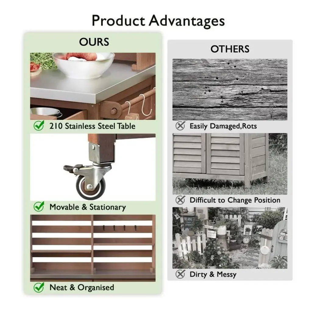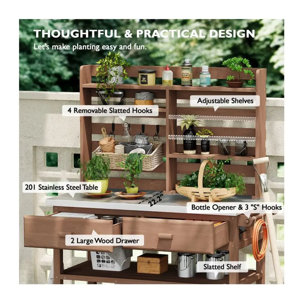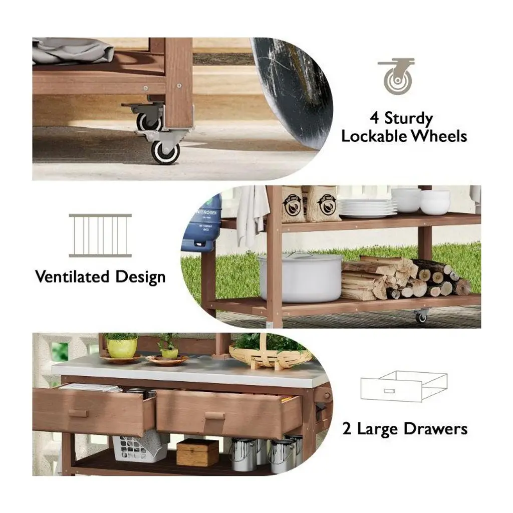 Crafted from durable fir wood, this waist-high bench offers a spacious stainless steel worktop, two large drawers, and a two-layer slatted open shelves for organized storage of gardening tools and supplies. Convenient side hooks and racks keep essentials within reach, while four lockable caster wheels allow for effortless mobility around your outdoor space. Its sturdy, multi-functional design is not only ideal for potting and garden tasks, but also serves perfectly as an outdoor kitchen island, providing ample space for food prep, grilling, or entertaining guests in any backyard setting.