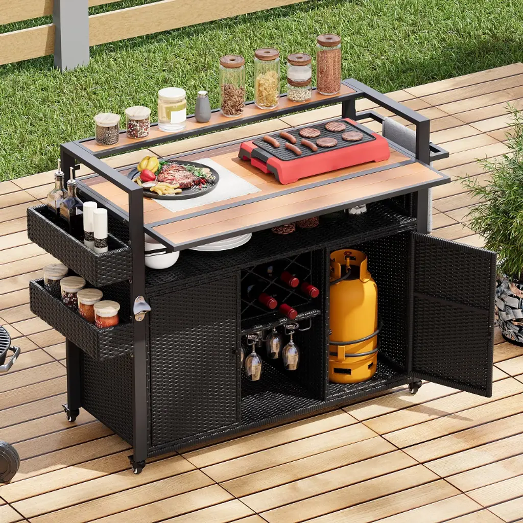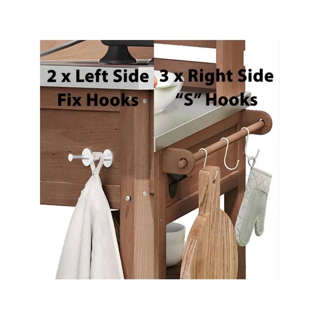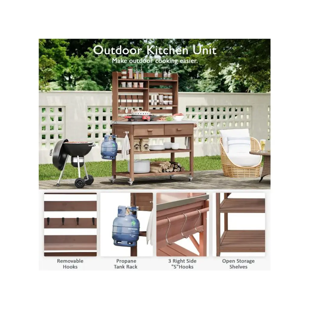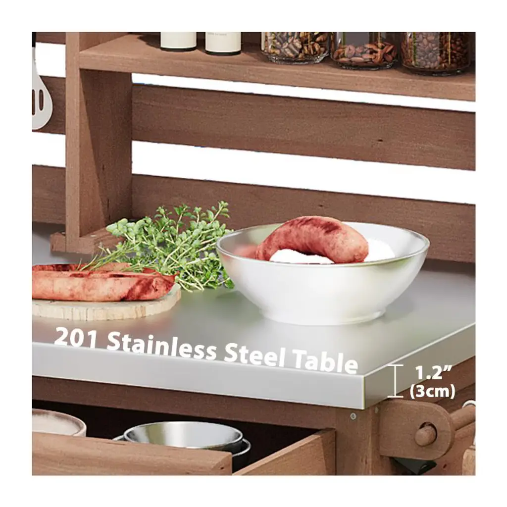 Crafted from durable fir wood, this waist-high bench offers a spacious stainless steel worktop, two large drawers, and a two-layer slatted open shelves for organized storage of gardening tools and supplies. Convenient side hooks and racks keep essentials within reach, while four lockable caster wheels allow for effortless mobility around your outdoor space. Its sturdy, multi-functional design is not only ideal for potting and garden tasks, but also serves perfectly as an outdoor kitchen island, providing ample space for food prep, grilling, or entertaining guests in any backyard setting.