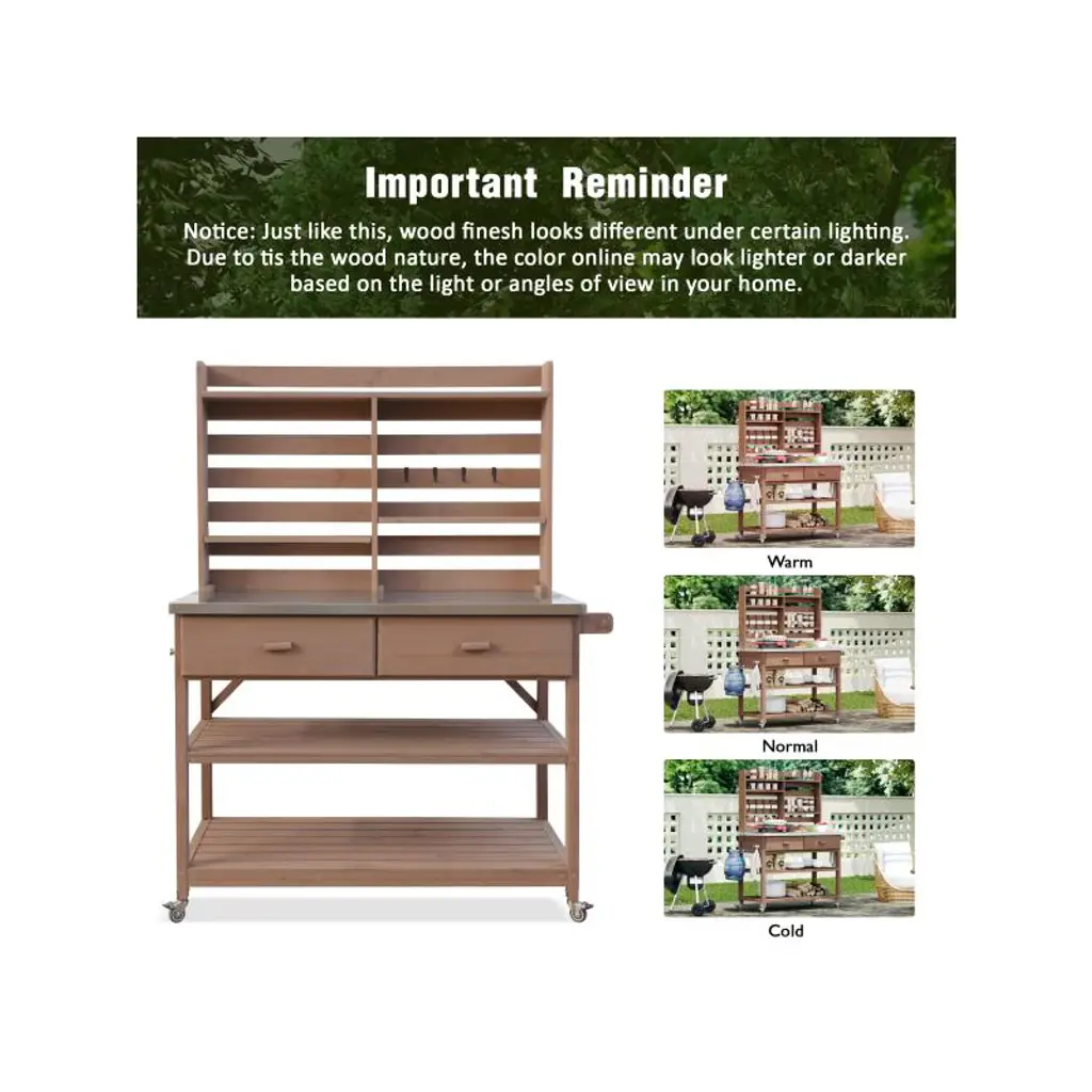 Yoocozz Fir Wood Mobile Garden Potting Bench & Kitchen Cart With Ample Storage And Stainless Steel Top - Brown