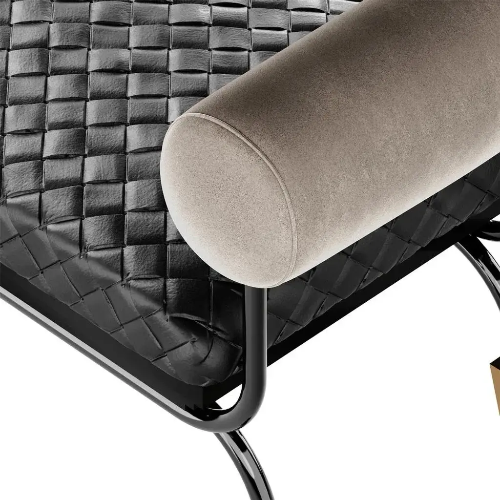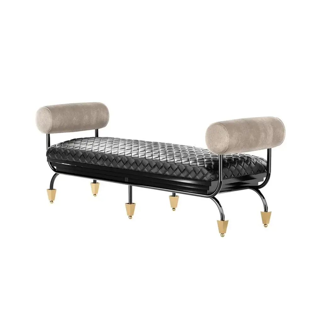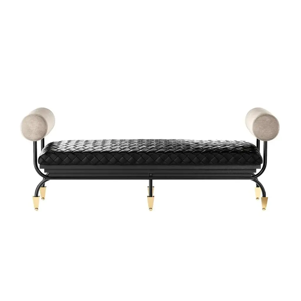 Zeus Bench is a modern bench design, perfect for a modern hotel lobby or a presidential suite. An upholstered leather seat with a sculptural and elegant base will provide your entryway with timeless sophistication. MATERIALS: Seat Upholstered in Leather; Arms Upholstered in Suede; Structure in Black Nickel and Gloss Black Lacquer; Legs in Gold Polished Stainless Steel.