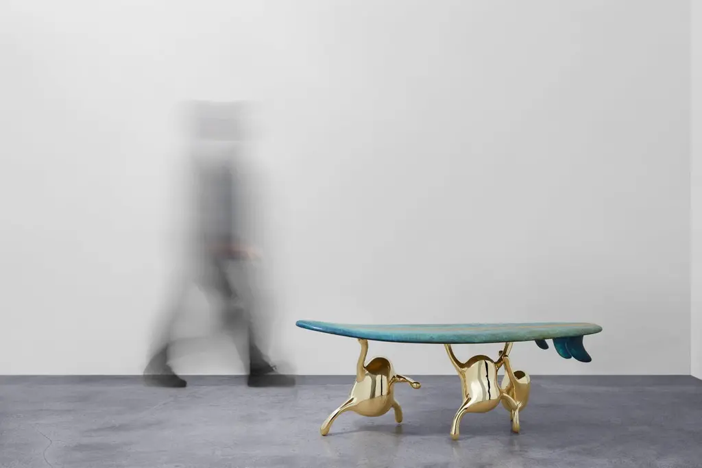 Zhipeng Tan’s ‘Surf’ bench embodies and further extends the concept of his most iconic collection, TanTan collection. “This year, we have been forced to isolate ourself from one another to maintain safety. Although staying home has become our default lifestyle, it ironically reminds us of holidays and leisure time that we used to take granted of,’ says Zhipeng. This year, he further explores his imaginary leisure time that we completely lost due to COVID-19, and captured it in the unique and playful little human forms, TanTan. The surf bench illustrates three TanTans carrying a surfboard and enjoying their summer time. The rich luster and versatility of brass compliment the spirited design, f?inding a harmonious fusion of sculpture and furniture, provocative objects of both beauty and utility.Zhipeng Tan'Surf,' 2020TanTan collectionMeasures: 20.5 H x 56 W x 16 D in52 H x 142 W x 40 D cm.