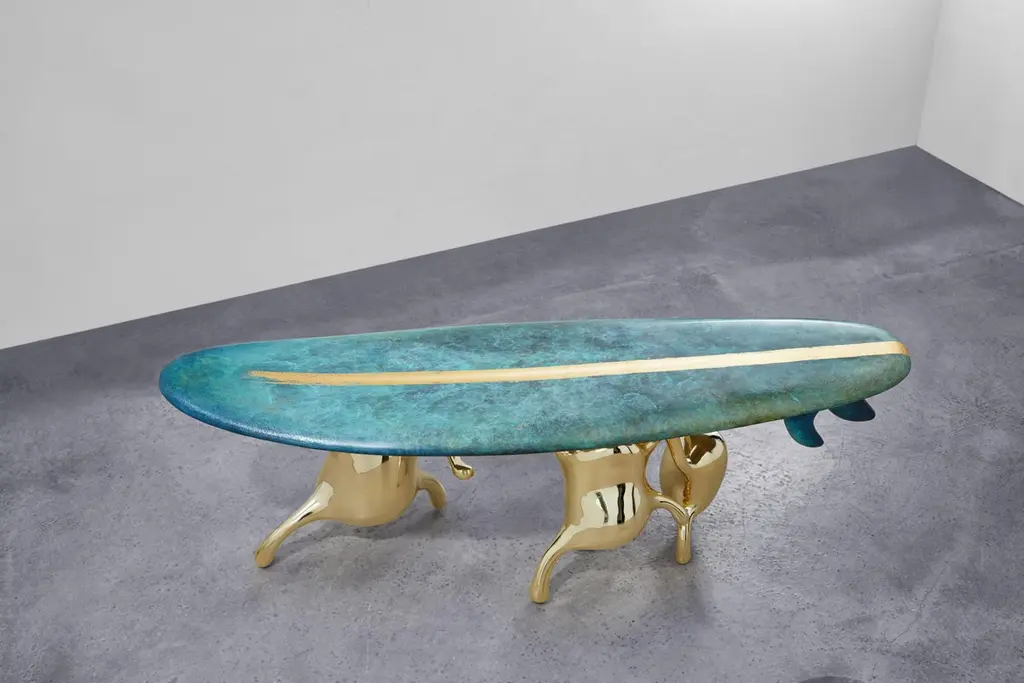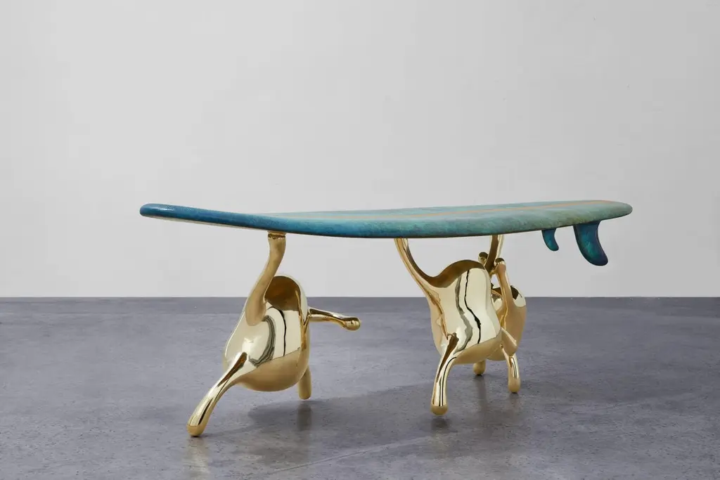 Zhipeng Tan’s ‘Surf’ bench embodies and further extends the concept of his most iconic collection, TanTan collection. “This year, we have been forced to isolate ourself from one another to maintain safety. Although staying home has become our default lifestyle, it ironically reminds us of holidays and leisure time that we used to take granted of,’ says Zhipeng. This year, he further explores his imaginary leisure time that we completely lost due to COVID-19, and captured it in the unique and playful little human forms, TanTan. The surf bench illustrates three TanTans carrying a surfboard and enjoying their summer time. The rich luster and versatility of brass compliment the spirited design, f?inding a harmonious fusion of sculpture and furniture, provocative objects of both beauty and utility.Zhipeng Tan'Surf,' 2020TanTan collectionMeasures: 20.5 H x 56 W x 16 D in52 H x 142 W x 40 D cm.