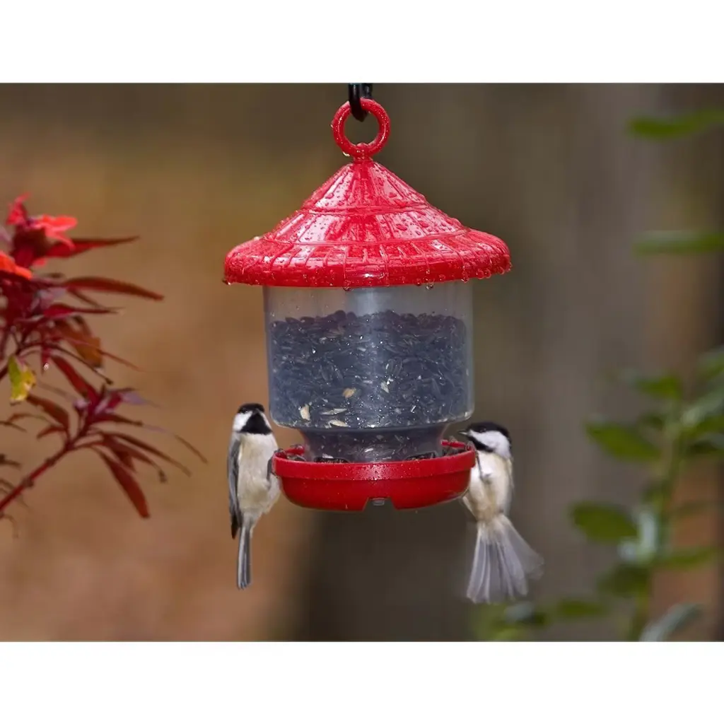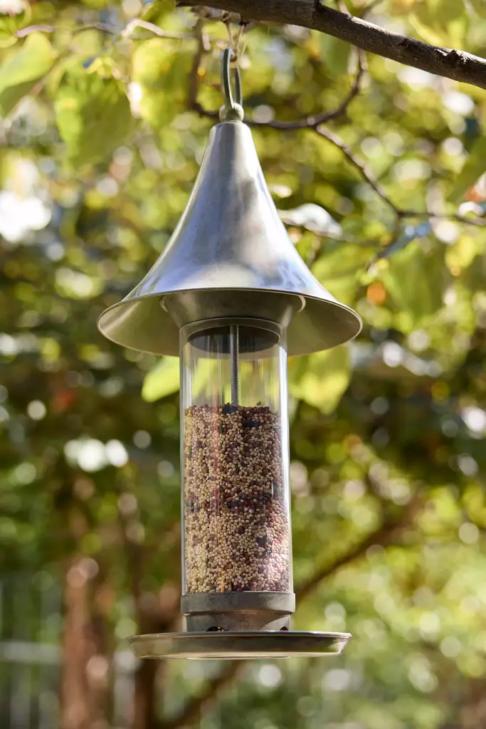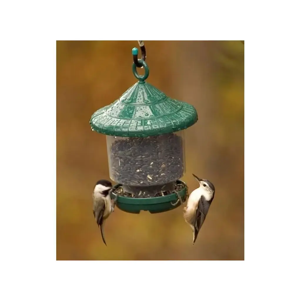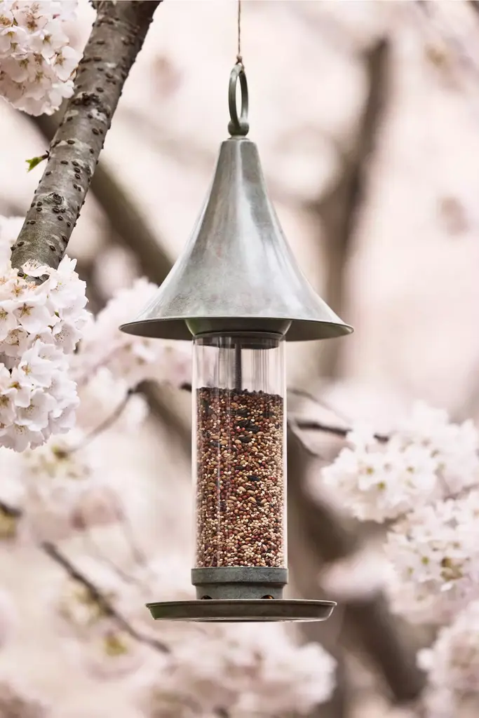A pagoda-style, verdigris copper roof and feeding tray lend polish to this hand-crafted bird feeder for the garden.