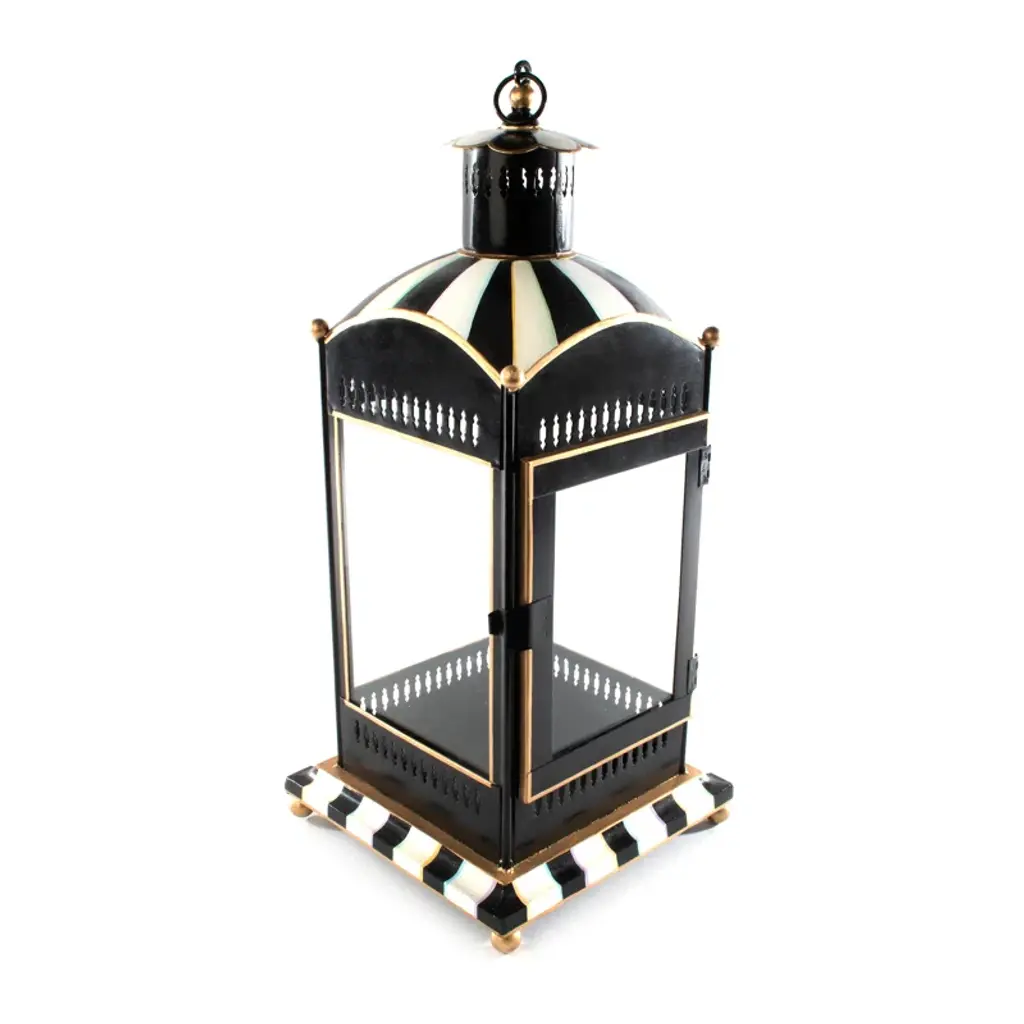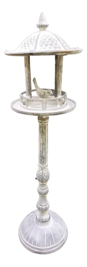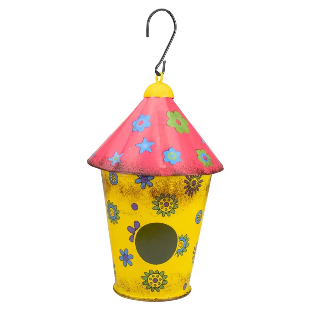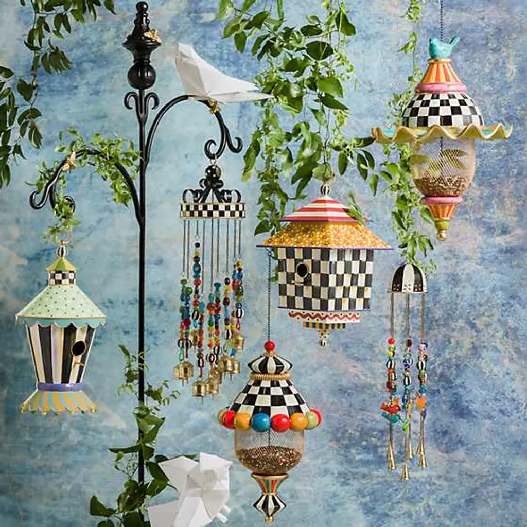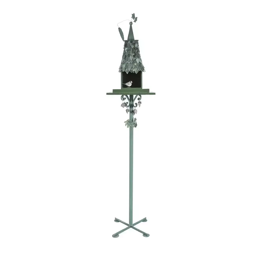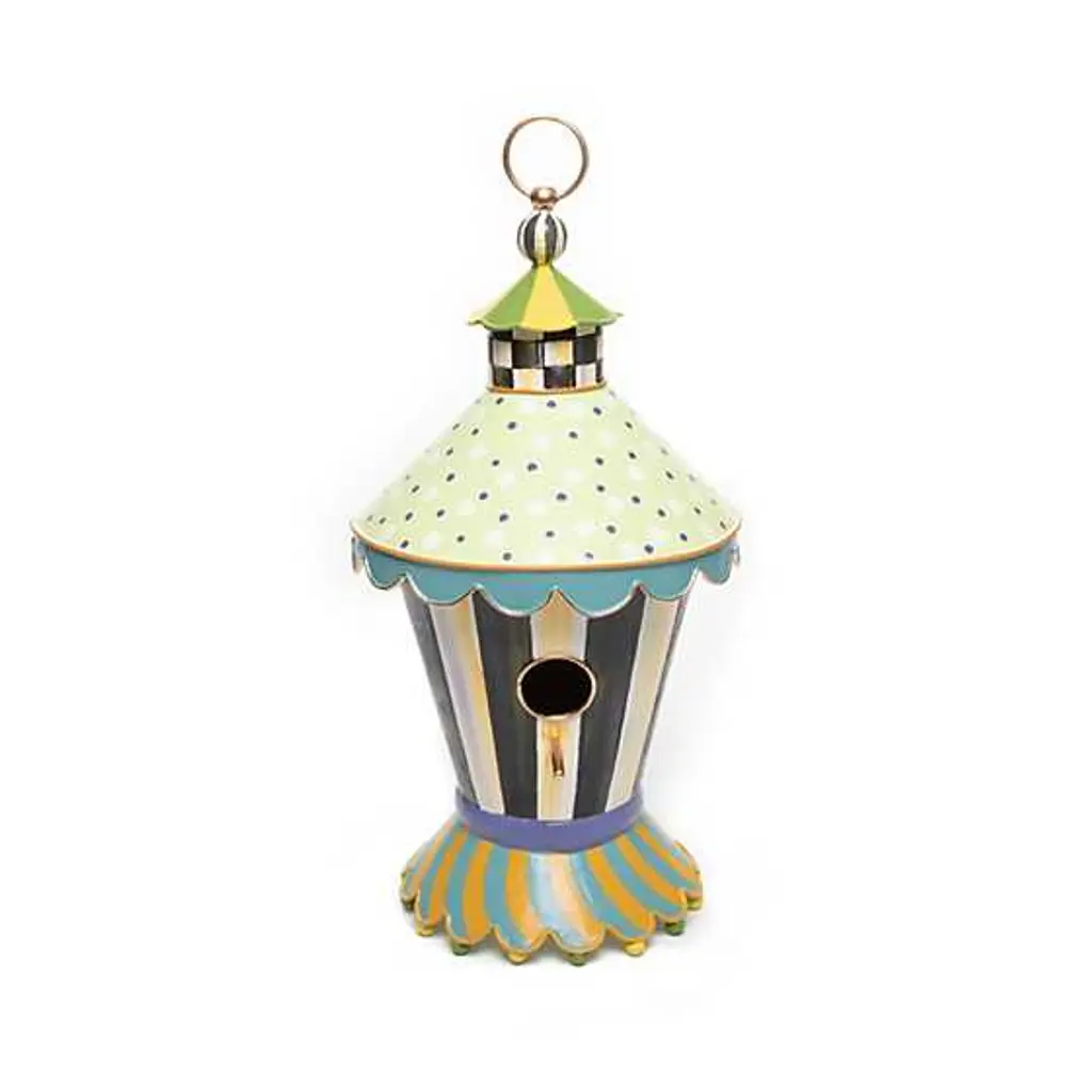 From its scalloped tin roof to its swirled base, the Courtly Stripe Birdhouse provides more than just a pretty perch for your feathered friends. This hand-painted metal roost is suitable for outdoor use during the warmer months. And brought inside when the songbirds fly south, it makes a festive decoration and reminder of what the next spring will bring!