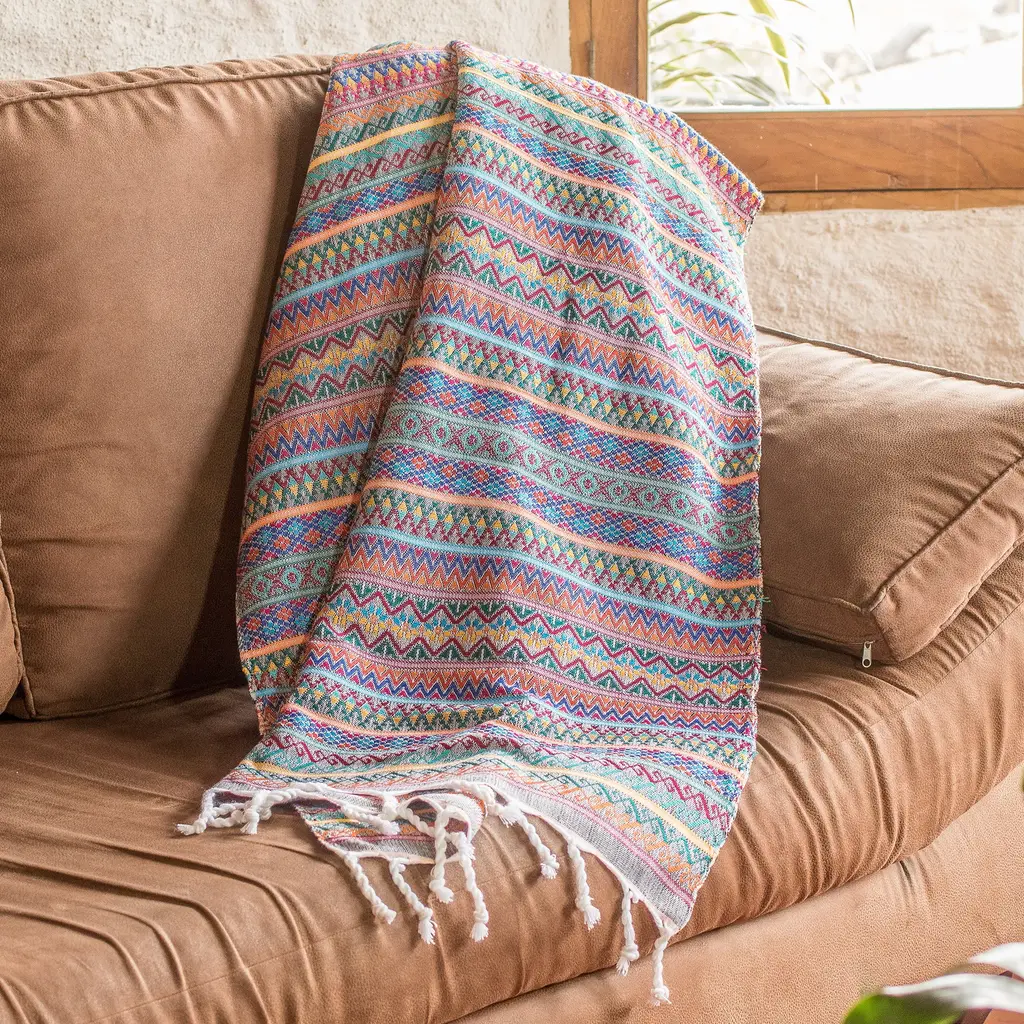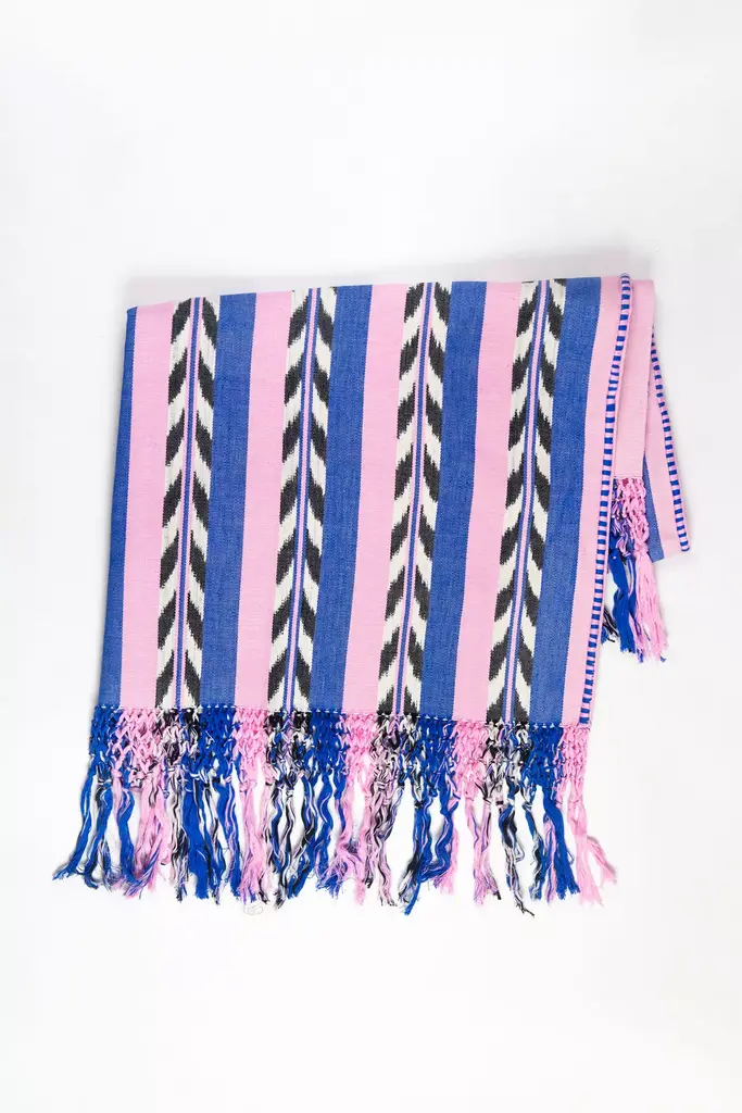 The Palm Blankte is the perfect accent youve been searching for. Pink and bold blue ikat blanket, ethically handwoven by artisans in Totonicapan, Guatemala on traditional footlooms. Hand ikat (jasp) dyed on natural white cotton. Archive New York is a line of handwoven, artisan made home decor products, founded in 2014 in Brooklyn, NY. The founder, Amira Marion, grew up in a home filled with Guatemalan textiles gathered by her parents in the 1970s. Her own designs emphasize a deep connection with Central American artisans, a commitment to Fair Trade practices, and the honoring of Maya culture, heritage and technique. * Handwoven 100% cotton.* Dry clean only, or hand wash cold, line dry.* Imported#### *Dimensions** 54"H x 71"W including fringe