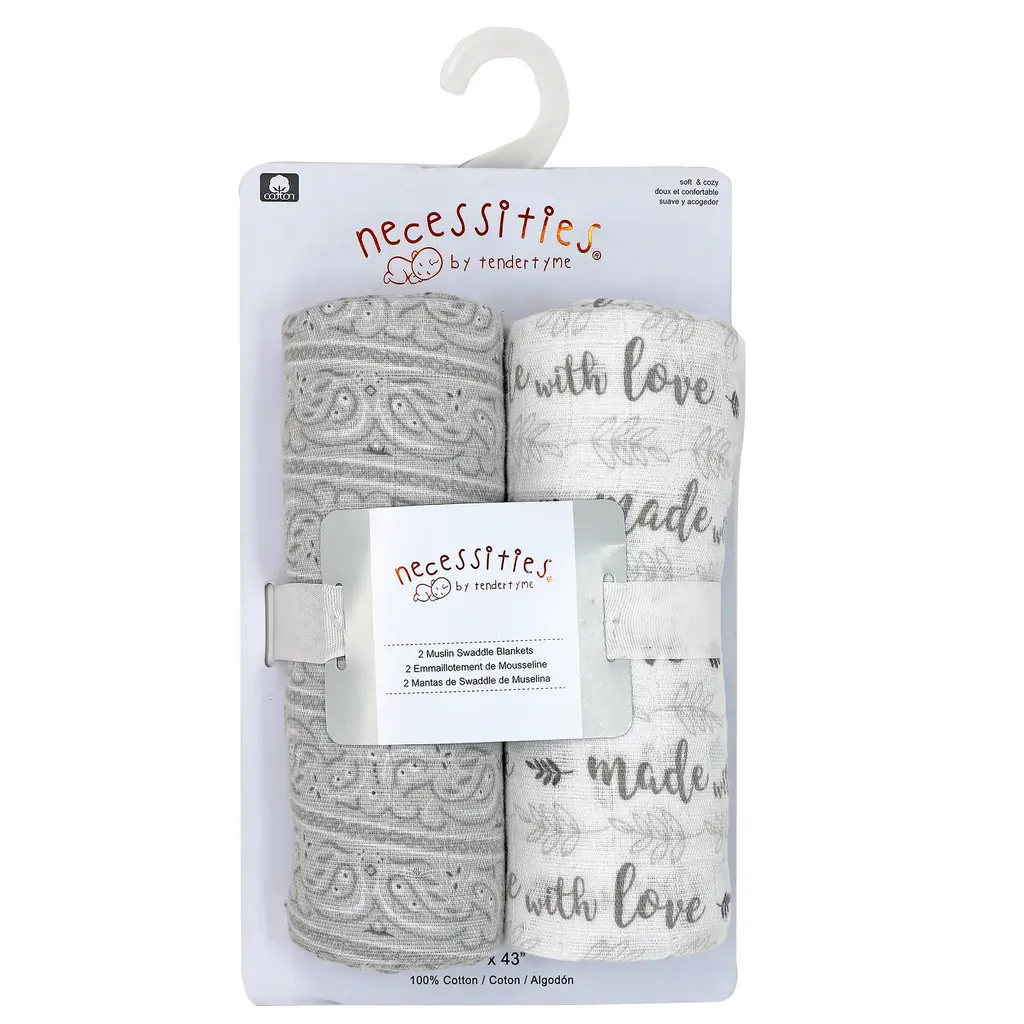 This two pack of swaddling blankets shows off sweet prints on breathable cotton muslin. Constructed from 100% cotton muslin, pieces are easy care, machine wash and dry. Allows for swaddling baby while the air still flows through the fabric. Each swaddling blanket measures 43 inches by 43 inches. Available in blue hot air balloons or pink Eiffel Tower prints.