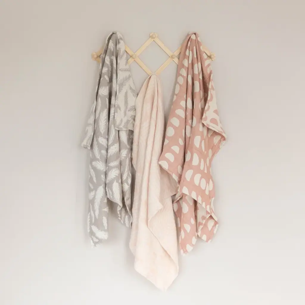 Muslin swaddle blankets are a staple that every nursery should include. The jacquard muslin baby blanket in the copper moon phase design is no exception. The eye-catching yet neutral colors of this design are great as an accent to your nursery or for taking on a stroll around the block in a baby’s carriage. This gorgeous swaddle will also pair beautifully with many of our baby bedding sets for a curated look.