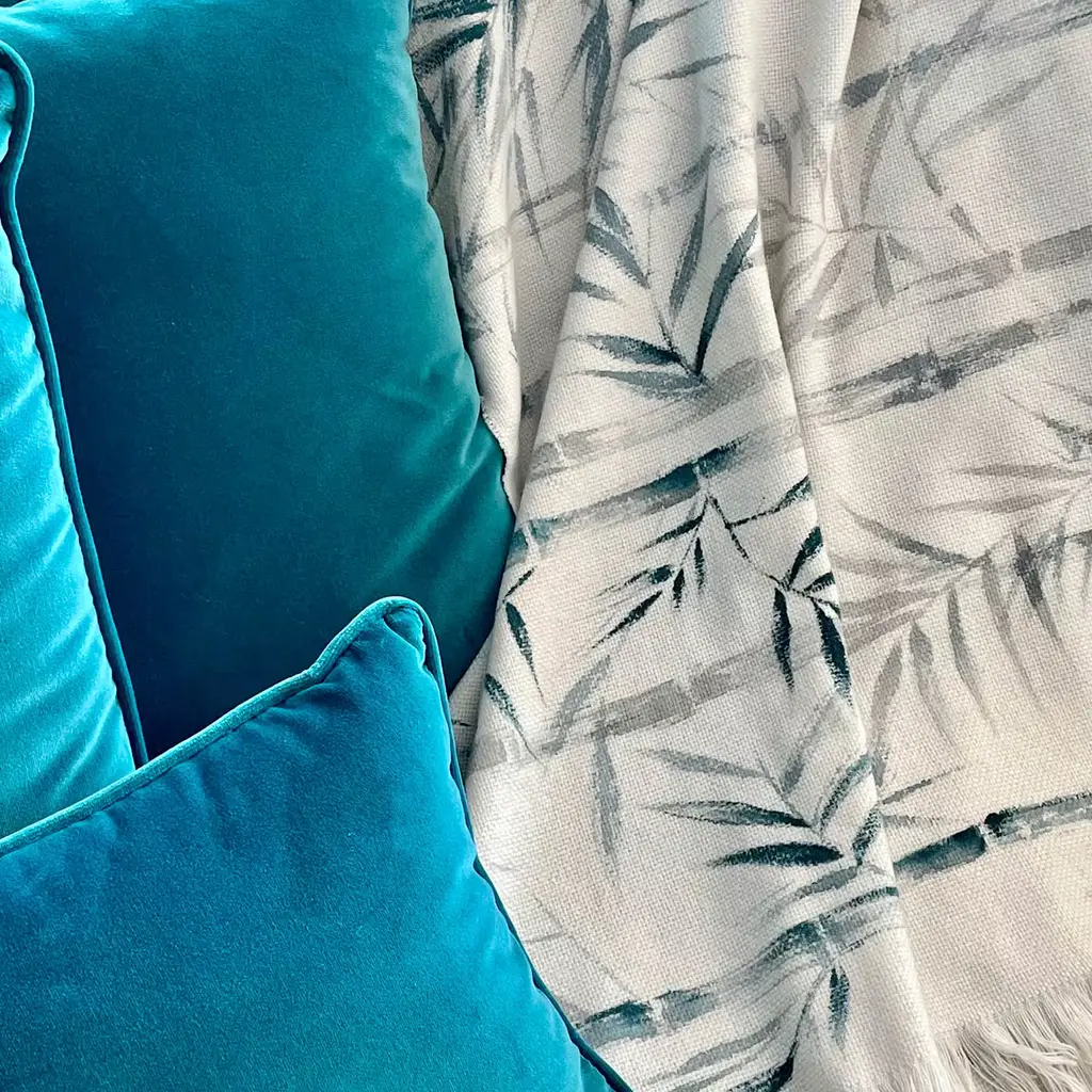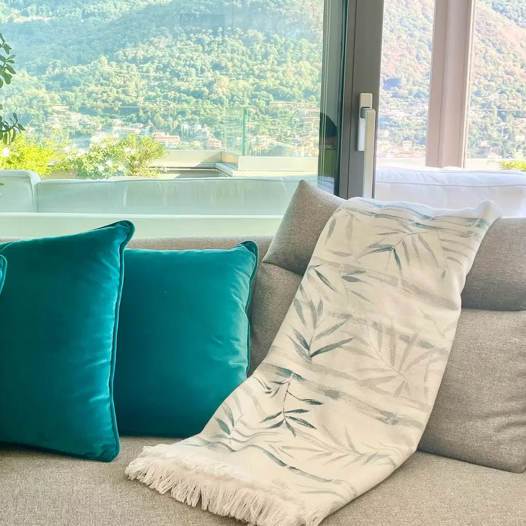 This superb blanket in fine off-white cashmere is a refined artisan piece coupling exceptional softness with unprecedented artistic flair. A graceful pattern of bamboo canes and leaves was deftly handpainted on its weft, woven by Como master weavers employing local techniques. Completed by a tone-on-tone fringed profile. Please dry clean only.