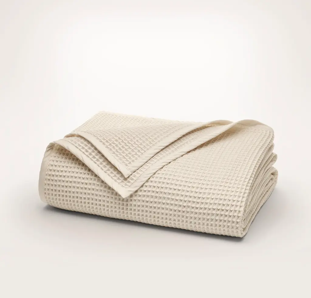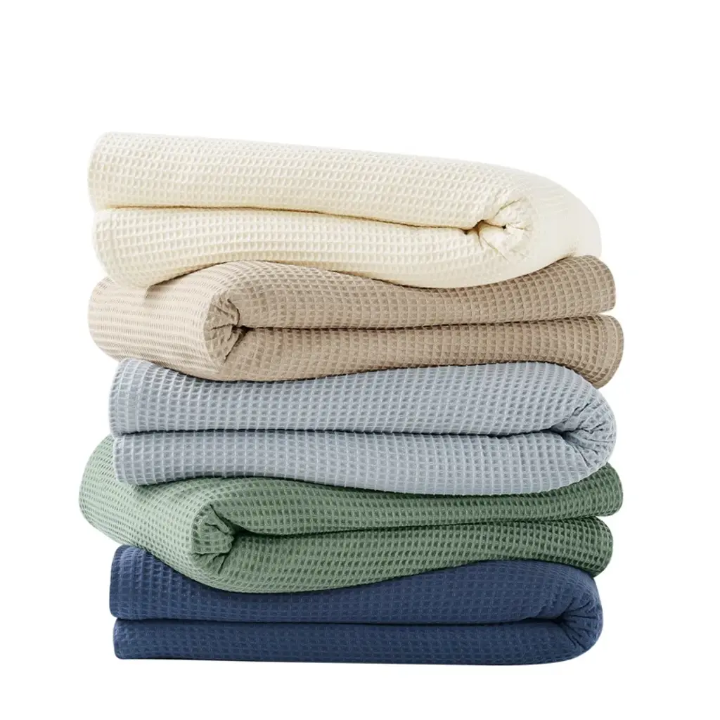 Customize your bedroom décor with this stylish waffle woven blanket by Cannon. This blanket features a midweight blend of cotton fibers that allows for breathable fabric and perfect temperature regulation. Use this blanket on its own in the warmer months and when it starts to get chilly out, add it as a top layer to your favorite Cannon comforter or quilt. This blanket is available in several stunning colors like; blue, green, grey, khaki and ivory that accentuates the trendy waffle weave pattern.