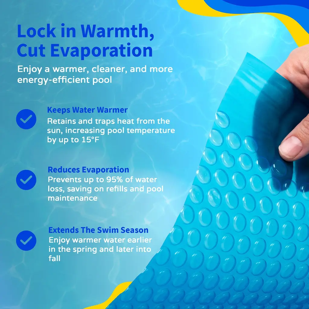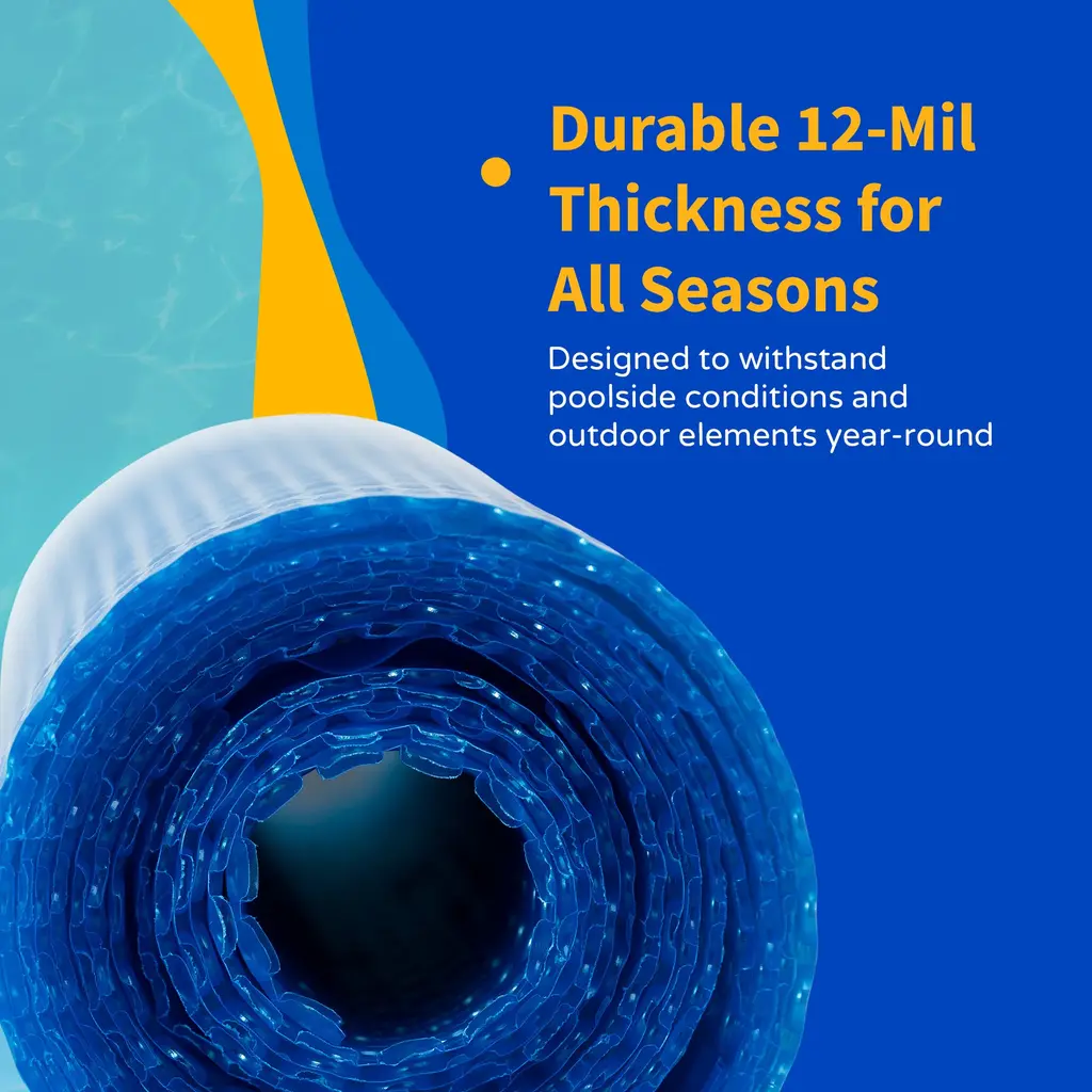 Reduce water evaporation with our 12-mil Rectangular Solar Blanket for In-Ground Pools. To optimize heat retention, this blanket has an opaque, blue color that allows the maximum amount of sunlight to reach the water. Thermal bubbles retain that warmth even after the sun is gone, keeping your pool water warm even on cloudy days and cool nights. This innovative technology can increase your pool’s temperature up to 15 degrees Fahrenheit. Backed by a 5-year warranty, our blankets are designed to withstand years of direct sunlight and harsh conditions.