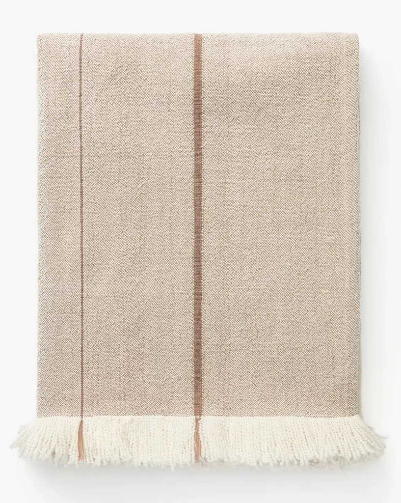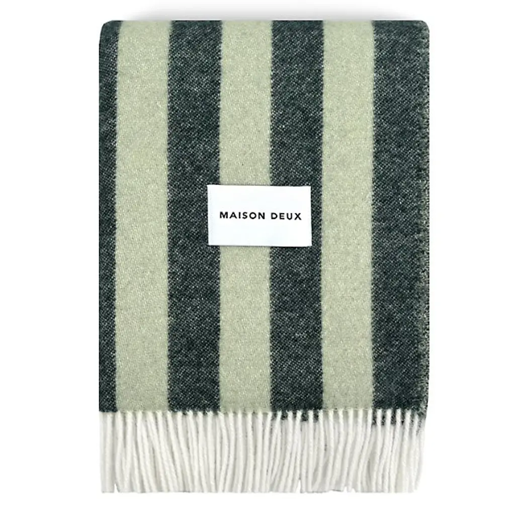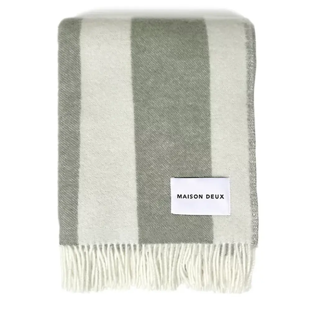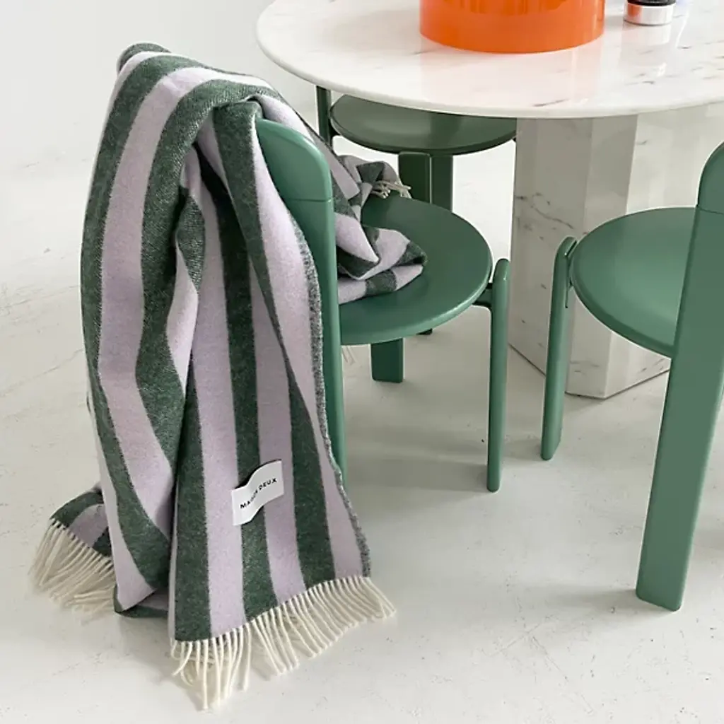 The Candy Wrap Blanket from Maison Deux is a luxurious jacquard-woven piece crafted from 100% New Zealand wool, featuring fringed edges and a mirror-inverted design on the reverse side. It offers ample space for sharing, keeping you warm while adding an elegant touch to your living room. Woven in Lithuania, it is Woolmark and OEKO-TEX certified, ensuring quality and sustainability. Wool is a natural, renewable, and biodegradable fiber, making it eco-friendly.