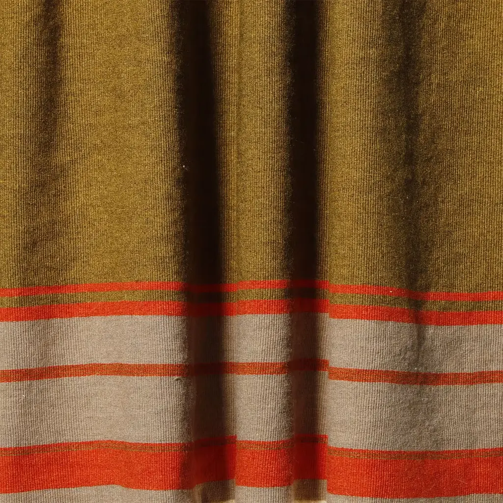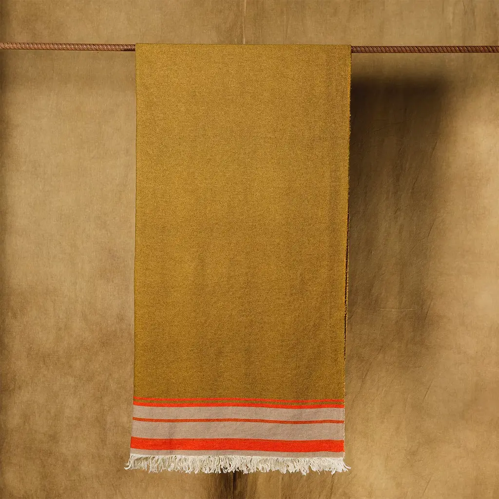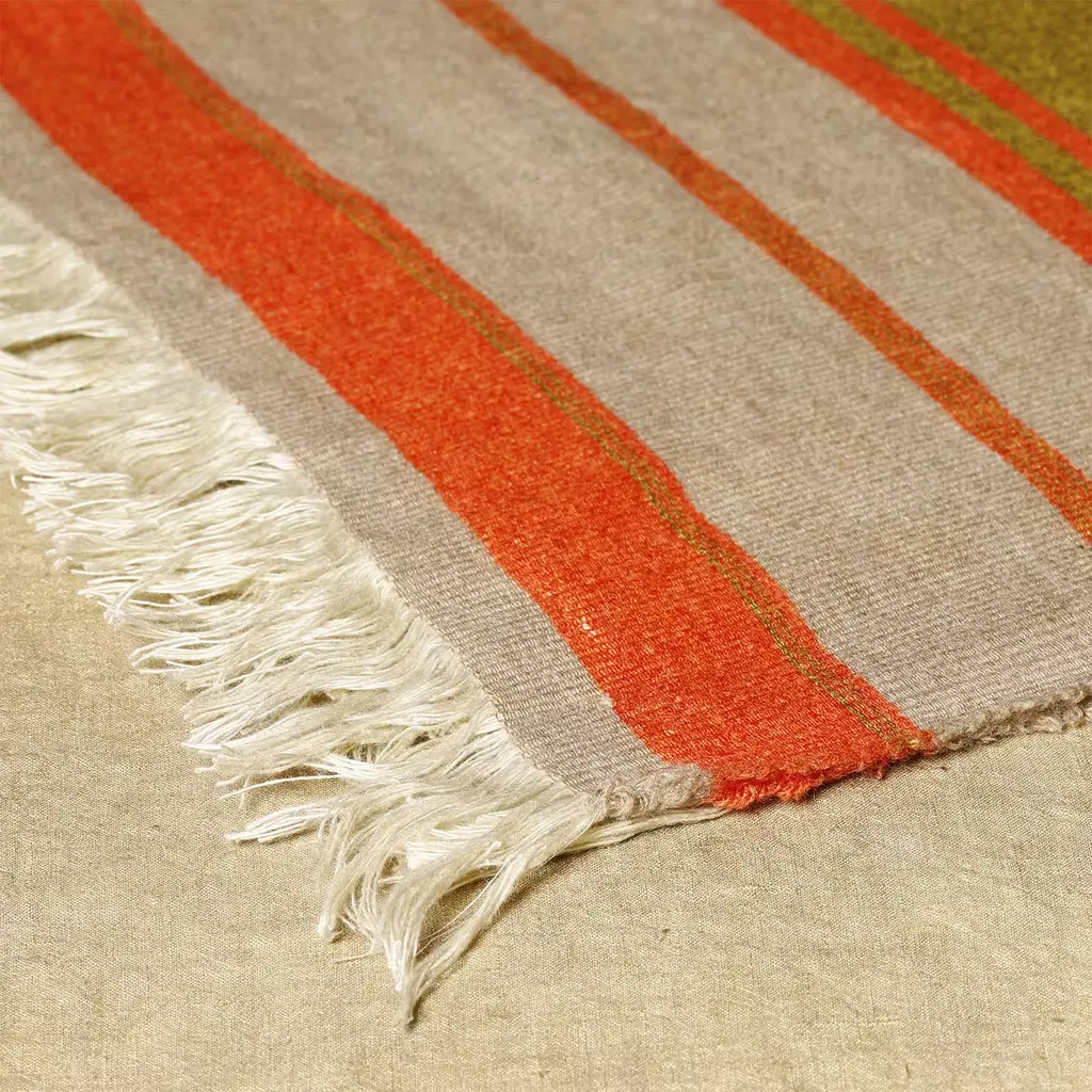 Vivid warm tones borrowed from gardens in bloom were selected for lending this soft artisan blanket its distinctive chromatic intensity. Deftly woven from wool and linen yarns, it ensures the ideal balance between warmth and freshness. Beige fringes along the profiles accent the design with a further dash of liveliness.