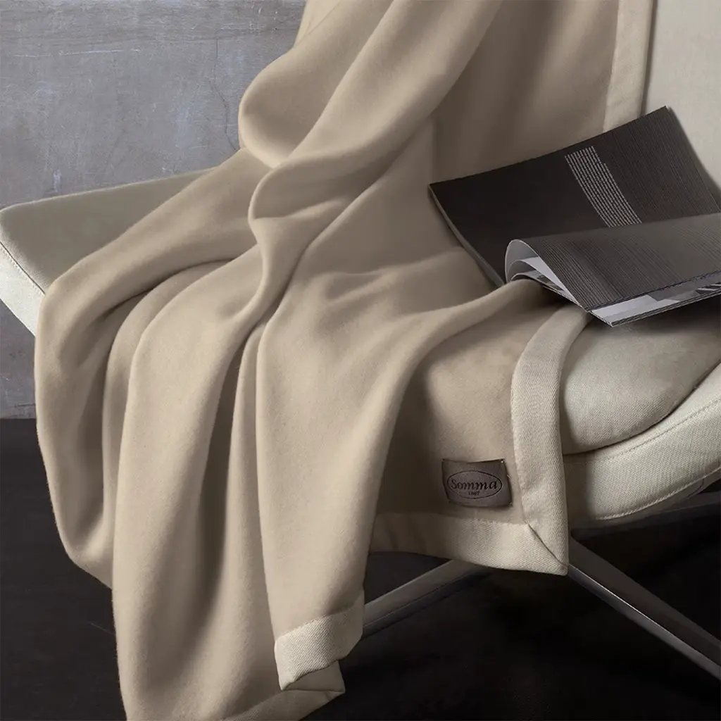 Versatile and tailored quality, this elegant blanket made of 100% Ultrafine Lamboswool Super is designed to give an irresistible warmth. The simplicity of its hues gives a cozy and cared-for ambiance, making it a must-have for relaxing moments. High-quality raw materials are carefully and carefully selected by SOMMA, processed with care and attention in Italy since 1867. Material: 100% Cashiver ultrafine lambswool super 100'S. Also available in 255x230 size.