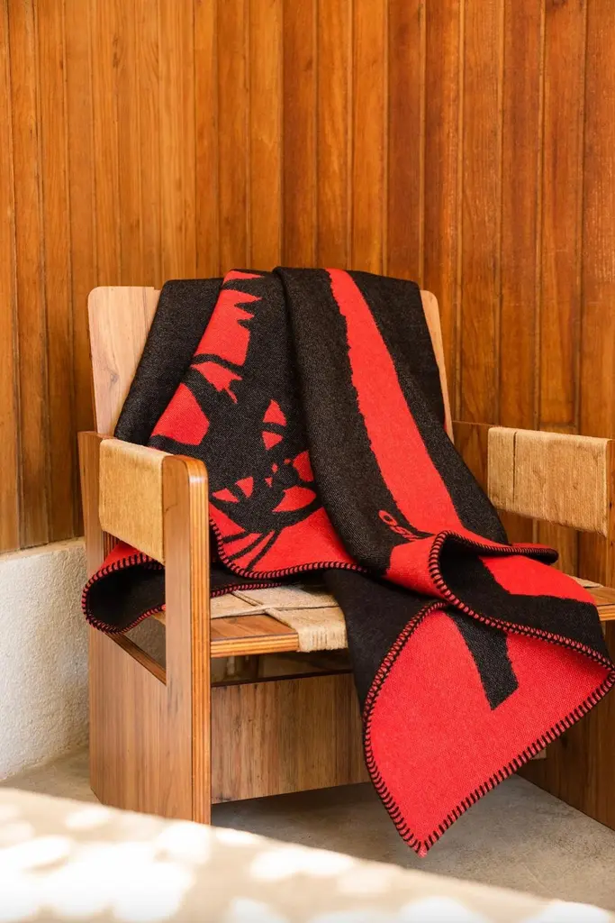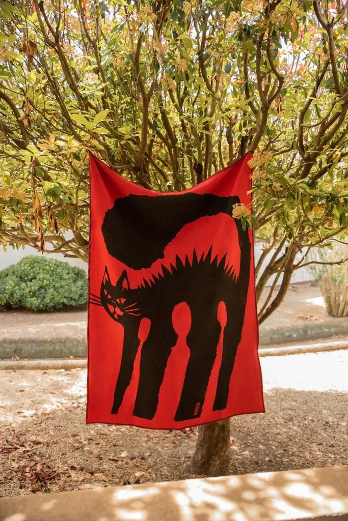 Made out of the finest Italian virgin wool, our cat/matches blankets are daring and bold. The sharp contrast between the cherry red and dark black makes these an eye-catching addition to any room. Thick in weight yet soft to the touch, each is finished skillfully with a whip-stitch border. Whether draped over a sofa or chair, at the foot of your bed, or hung on the wall as decor, our cat jumps out at you in the best way. Made in Italy.