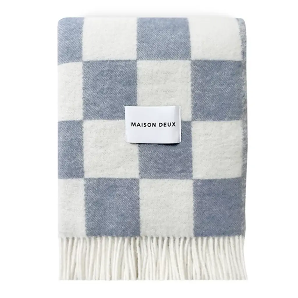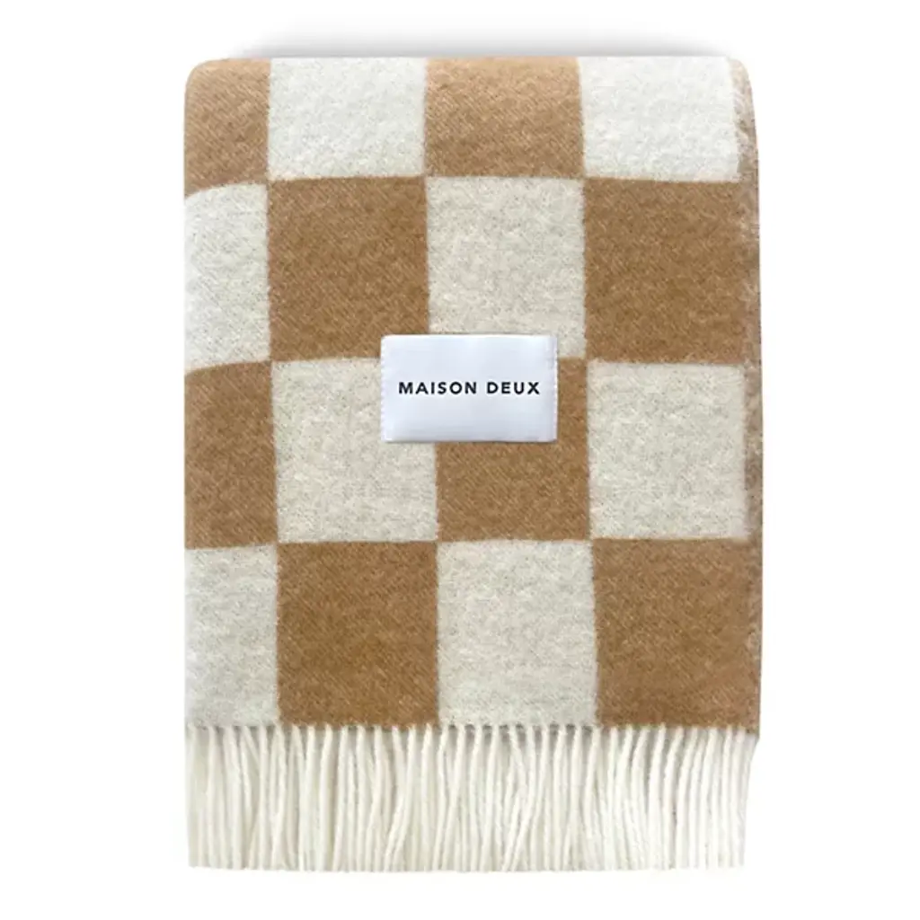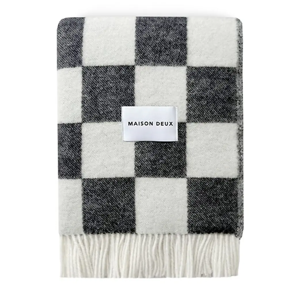 The Checkerboard Blanket from Maison Deux brings both comfort and style to your living space. Woven from 100% New Zealand wool, this thick, premium blanket features fringed edges on its short edges and a reversible design with a mirror-inverted pattern for playful versatility. It’s certified by Woolmark and OEKO-TEX for its natural, renewable, and biodegradable qualities, perfect for cozy nights alone or with company. Made in Lithuania, it’s a sustainable choice with mid-century modern appeal.