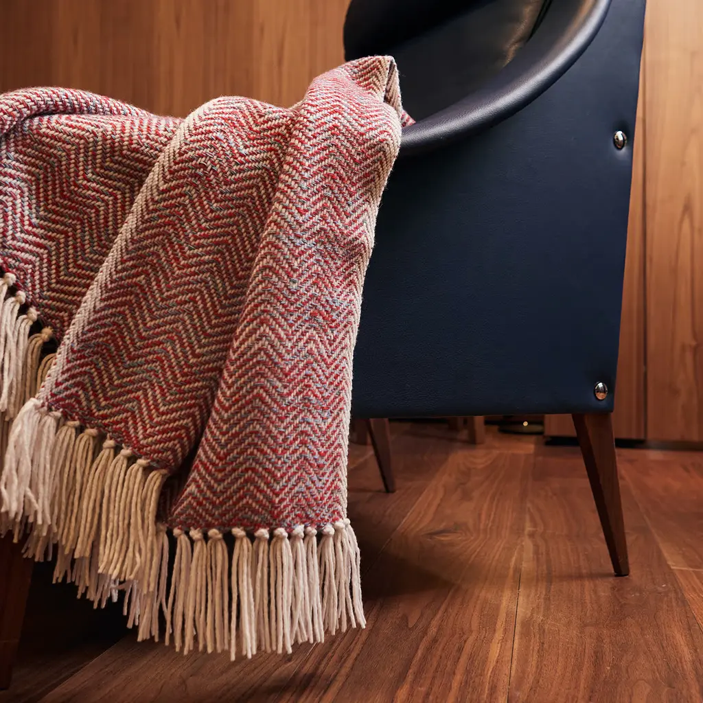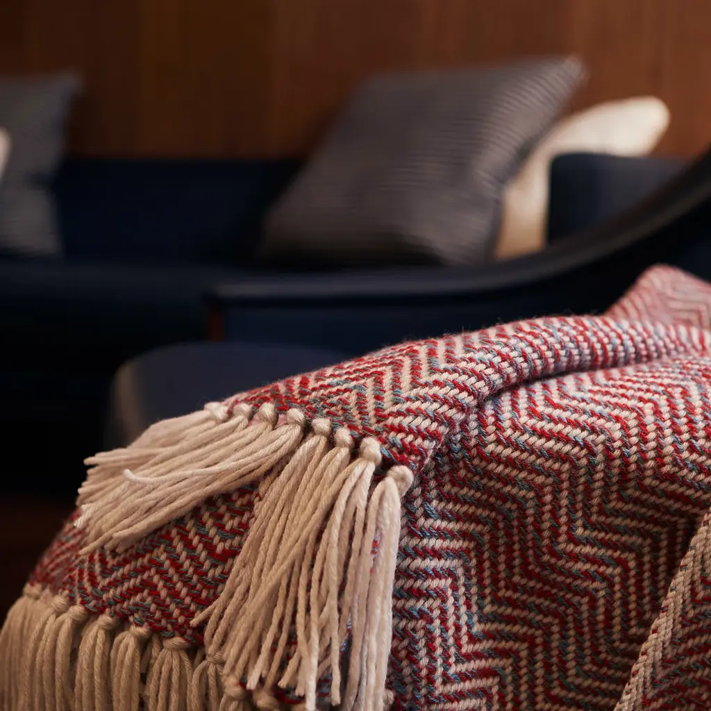 A soft plaid woven on old artisan looms using slow and careful techniques. The texture is a reinterpretation of the classic chevron weave, made maxi and multi-colored. All our yarns are regenerated. Material: 60% wool and 40% cashmere.