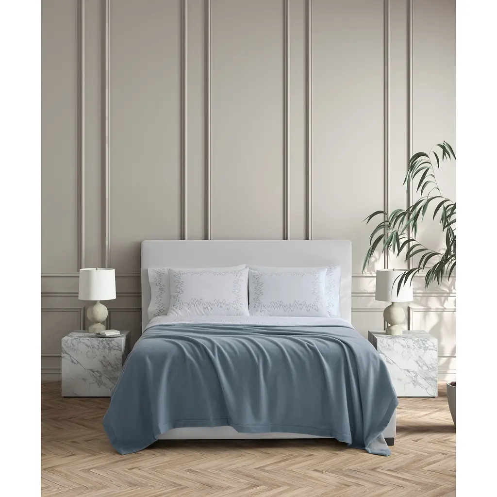 Crafted from superfine merino wool, the Cosmo Bedding Collection from Matouk features crisp mitered edges and a range of versatile colors.