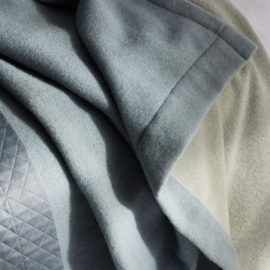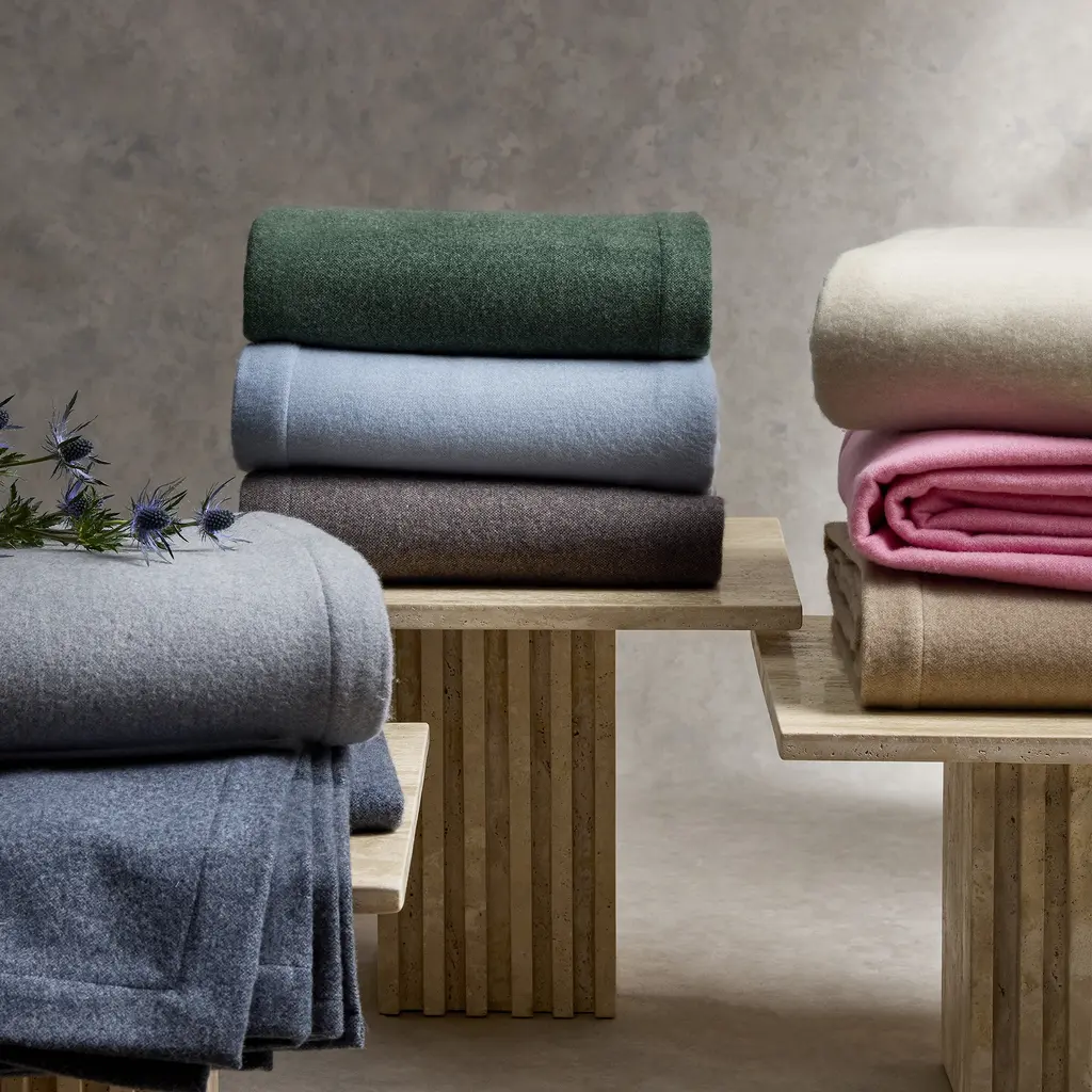 Crafted from superfine merino wool, the Cosmo Bedding Collection from Matouk features crisp mitered edges and a range of versatile colors.